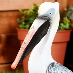 Gondosan megformált tollazat, a csőr alakja és a kézi hatású festés látványos dekorációs elemmé teszi bármely kültéri térben.
