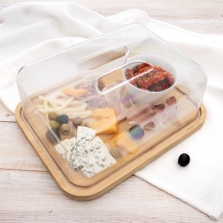 Elegáns bambusz tálalódeszka átlátszó búrával, amely megbízhatóan védi az ételeket, miközben stílusosan prezentálja azokat. Ideális sajtokhoz, felvágottakhoz, desszertekhez és gyümölcsökhöz. A tartós bambusz tálca és a praktikus fogantyúval ellátott fedél tovább frissen tartja az ételeket, és megóvja őket a portól és a rovaroktól – tökéletes otthoni tálaláshoz és kerti összejövetelekhez is.