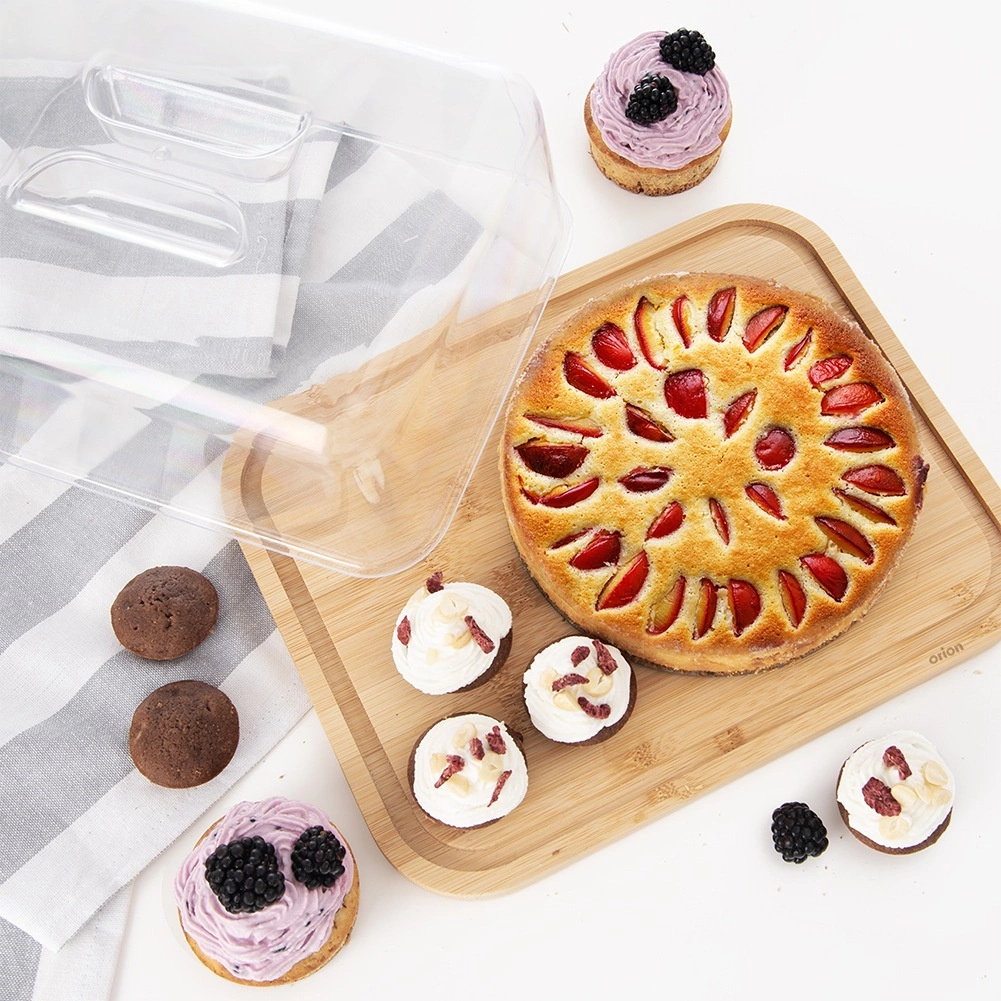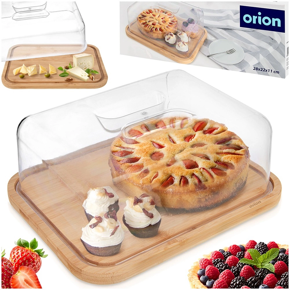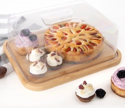 Ez a téglalap alakú bambusz tálalódeszka átlátszó búrával a mindennapi tálaláshoz és élelmiszertároláshoz készült. A 28 × 22 × 11 cm-es méret a búrával együtt elegendő helyet biztosít sajtoknak, szendvicseknek, desszerteknek vagy gyümölcsnek. Az átlátszó fedél integrált fogantyúval gyors hozzáférést biztosít, miközben megőrzi a kínált finomságok frissességét.