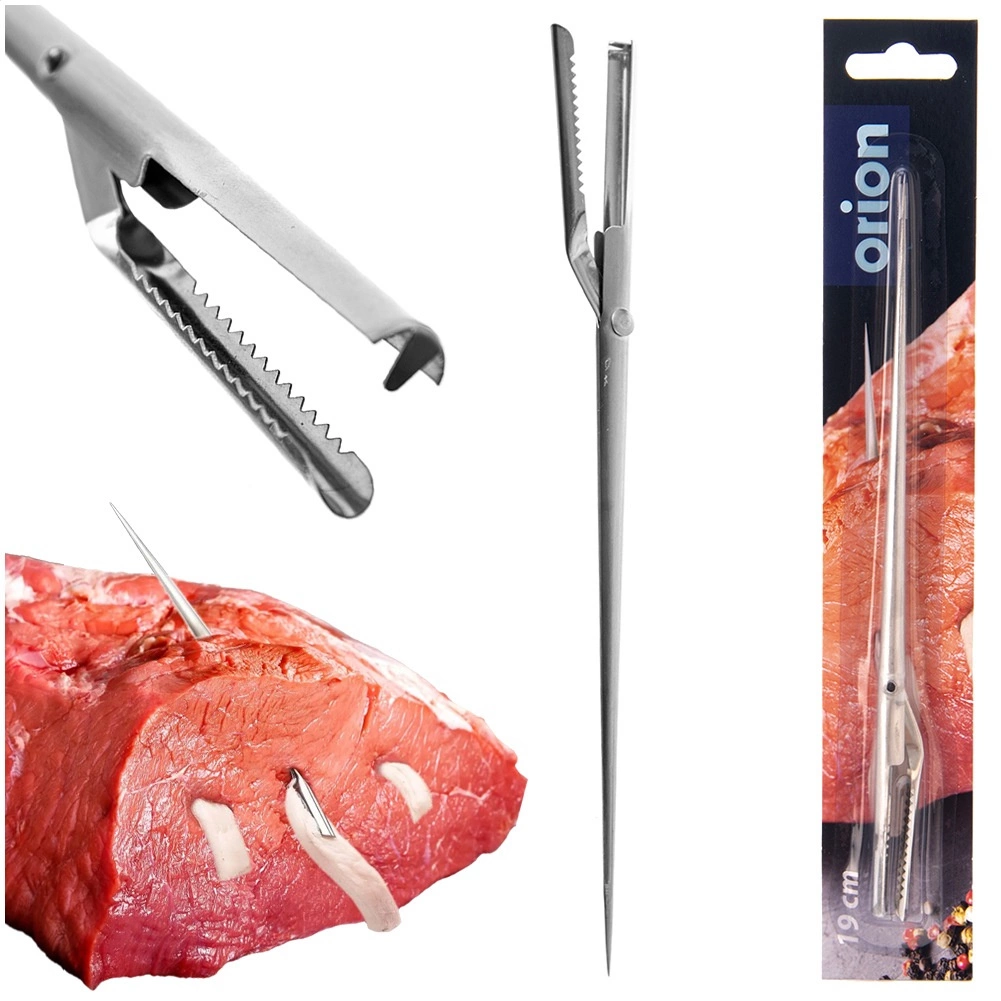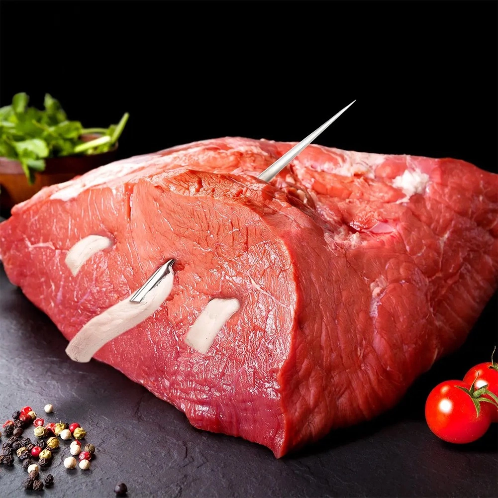 Hosszú, karcsú tűje sima behatolást biztosít, így a szalonna vagy zöldség mélyen a húsba juttatható, az összetevők pedig egyenletesen oszlanak el.