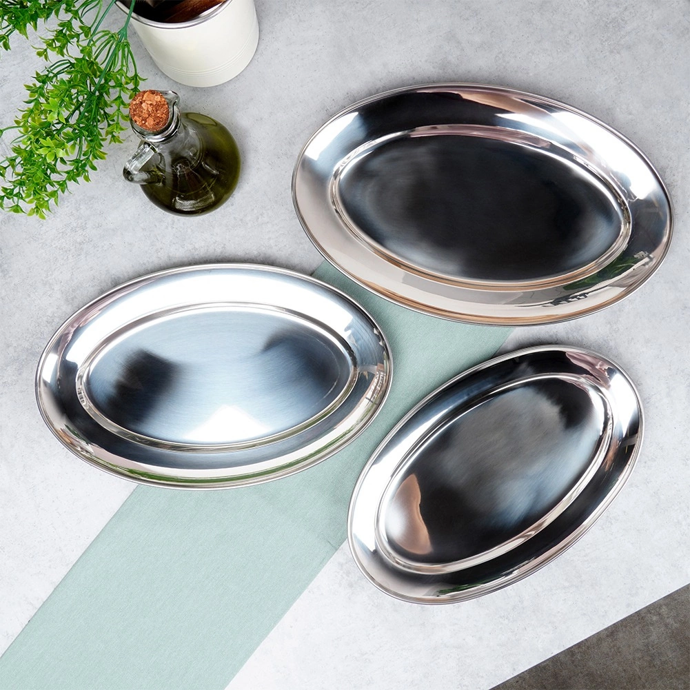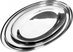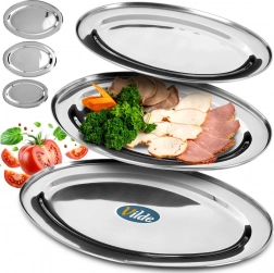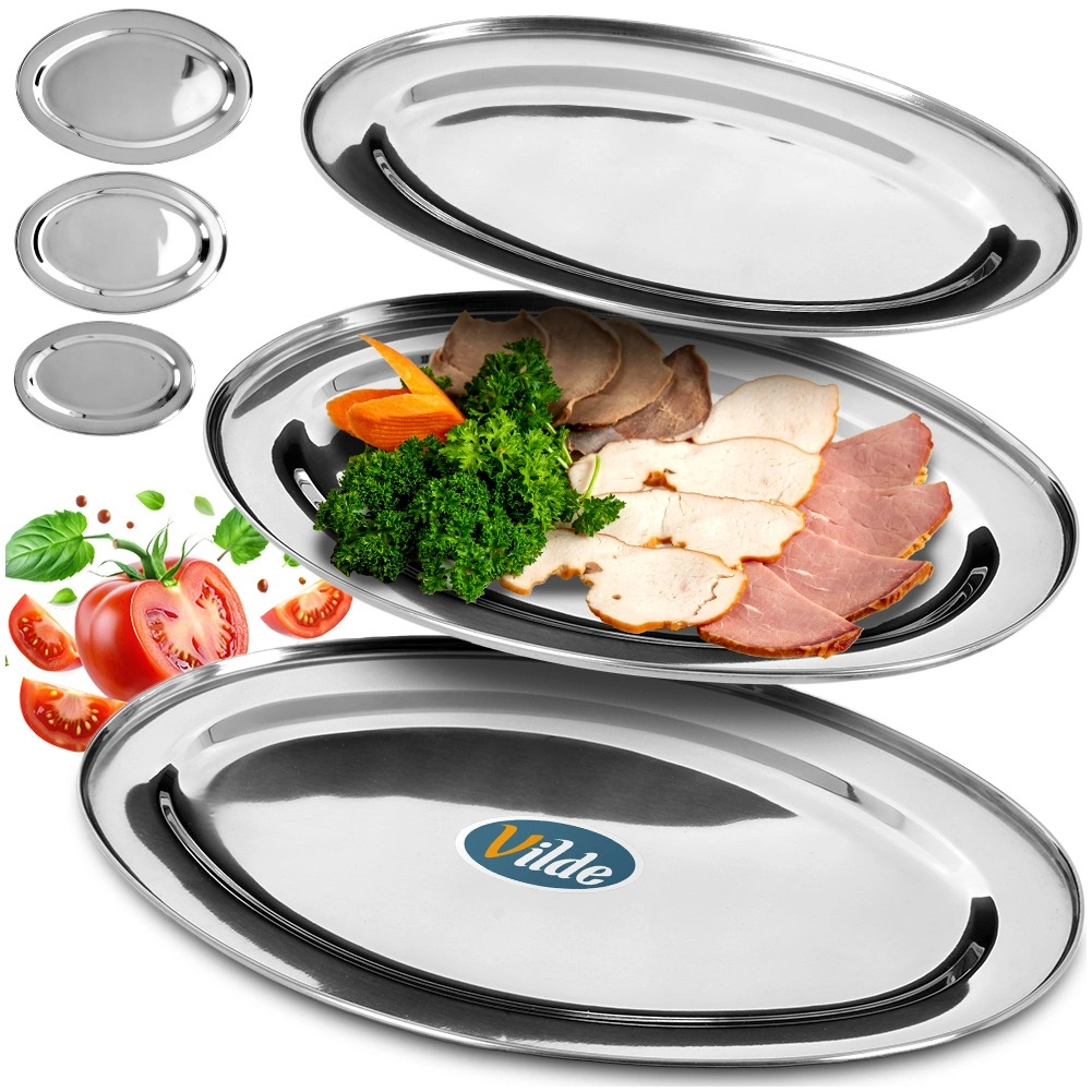 Elegáns, három darabból álló ovális tálcakészlet fényes felületű rozsdamentes acélból a stílusos tálaláshoz. Ideális előételekhez, hidegtálakhoz, desszertekhez és gyümölcsökhöz, otthoni és gasztronómiai felhasználásra egyaránt. Masszív és stabil kivitel megemelt peremmel, amely megakadályozza a szaftok kifolyását. Időtálló design, amely remekül illik bármilyen terítékhez.