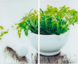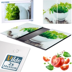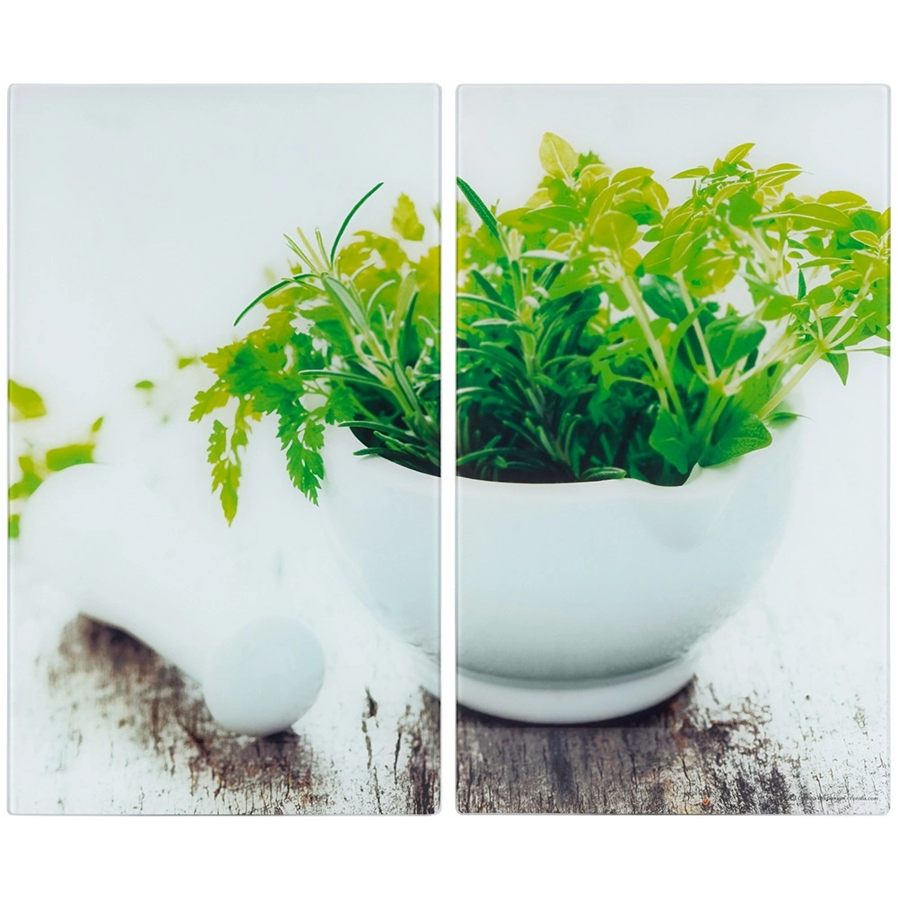 Praktikus, kételemes készlet egészségre ártalmatlan edzett üvegből, amely bővíti a munkafelületet, és egyben megóvja a főzőlapot a sérülésektől. Egy lap mérete 52 × 30 × 0,4 cm, együtt kb. 60 × 52 cm munkateret alkotnak. A fényes, friss fűszernövény-mintás felület nem porózus – nem nyeli el a szagokat vagy a folyadékokat.