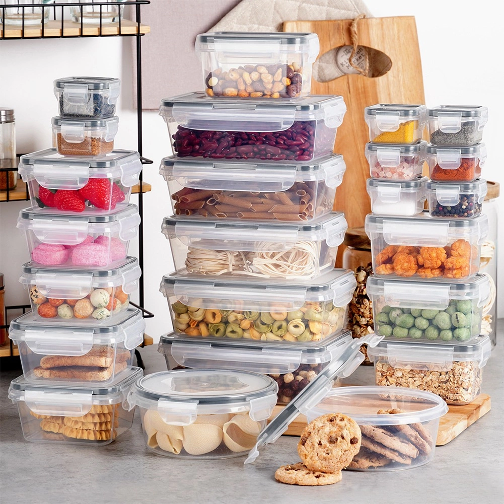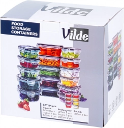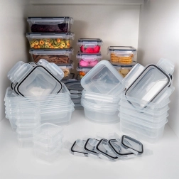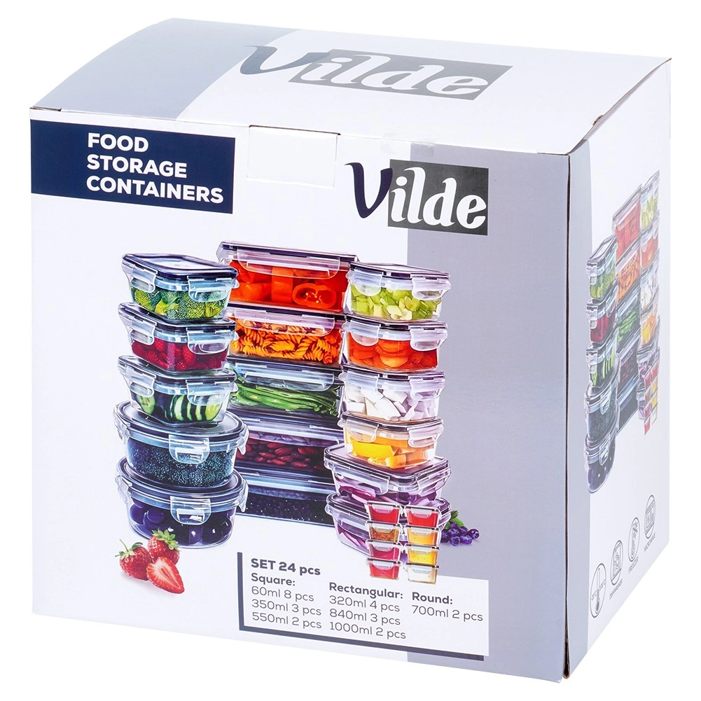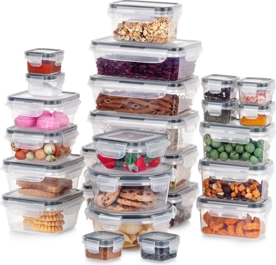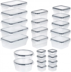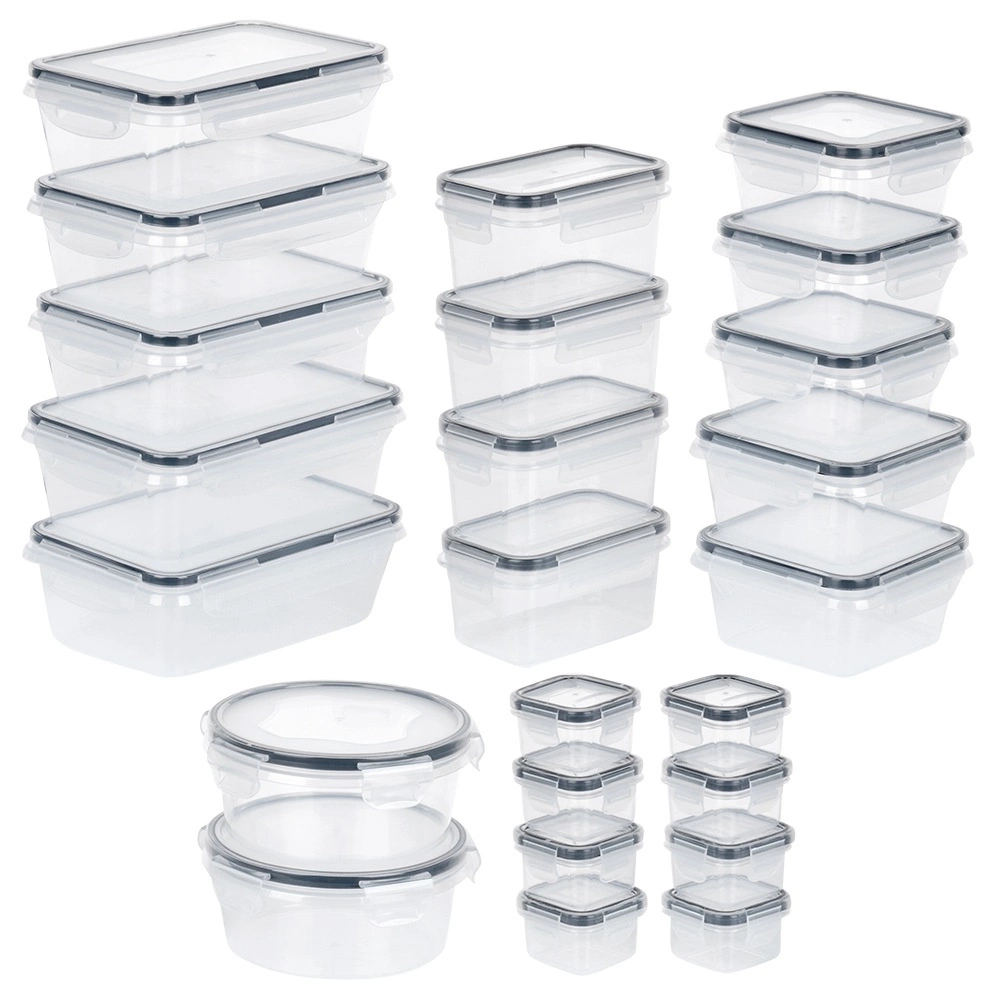 Ez a sokoldalú, 24 darabos készlet hétféle mérettel segít rendet tartani a kamrában és a hűtőben. A kis dobozoktól fűszerekhez és szószokhoz a nagyobb edényekig tésztához, gabonapelyhekhez vagy kész ételekhez – mindig szem előtt lesz a tartalom a víztiszta műanyagnak köszönhetően, és biztonságosan zárva marad a 4 kapcsos, szorosan záródó fedéllel.