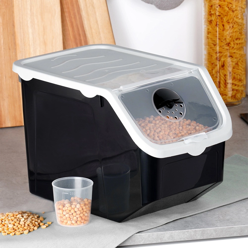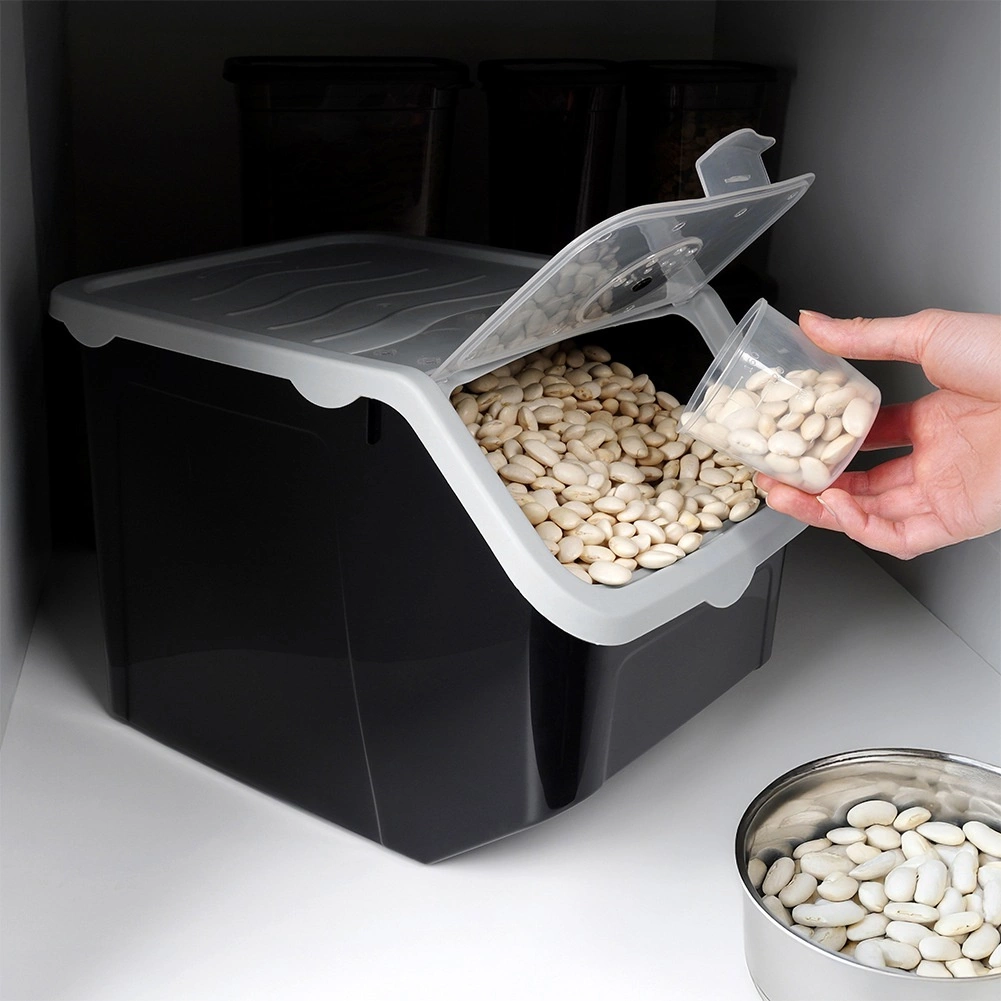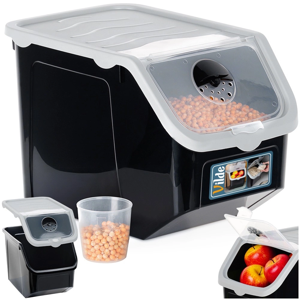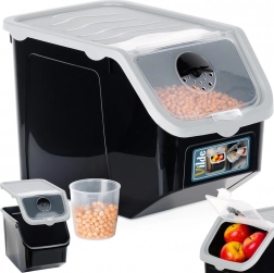 A doboz minőségi, fekete műanyagból készült szürke fedéllel, élelmiszerrel érintkezésre alkalmas, -20 °C és 100 °C közötti hőmérsékletet bír, használható fagyasztóban és mosogatógépben is. Remek választás hüvelyesekhez, rizshez, tésztához, kedvenc háziállata eledeléhez vagy akár mosószerekhez. A pontos adagolást egy praktikus mérőpohár segíti.