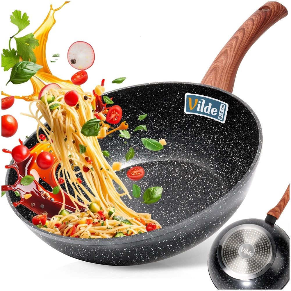 Fedezze fel a praktikus gránit wokot a VILDE Black&Wood kollekció elegáns fekete–fa kombinációjában. A mély, lekerekített test kényelmessé teszi a pirítást, keverést és a levegőben dobást is, míg a tapadásmentes gránit felület megkönnyíti az ételek kioldását és a gyors rendrakást.