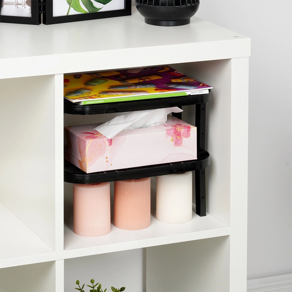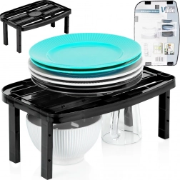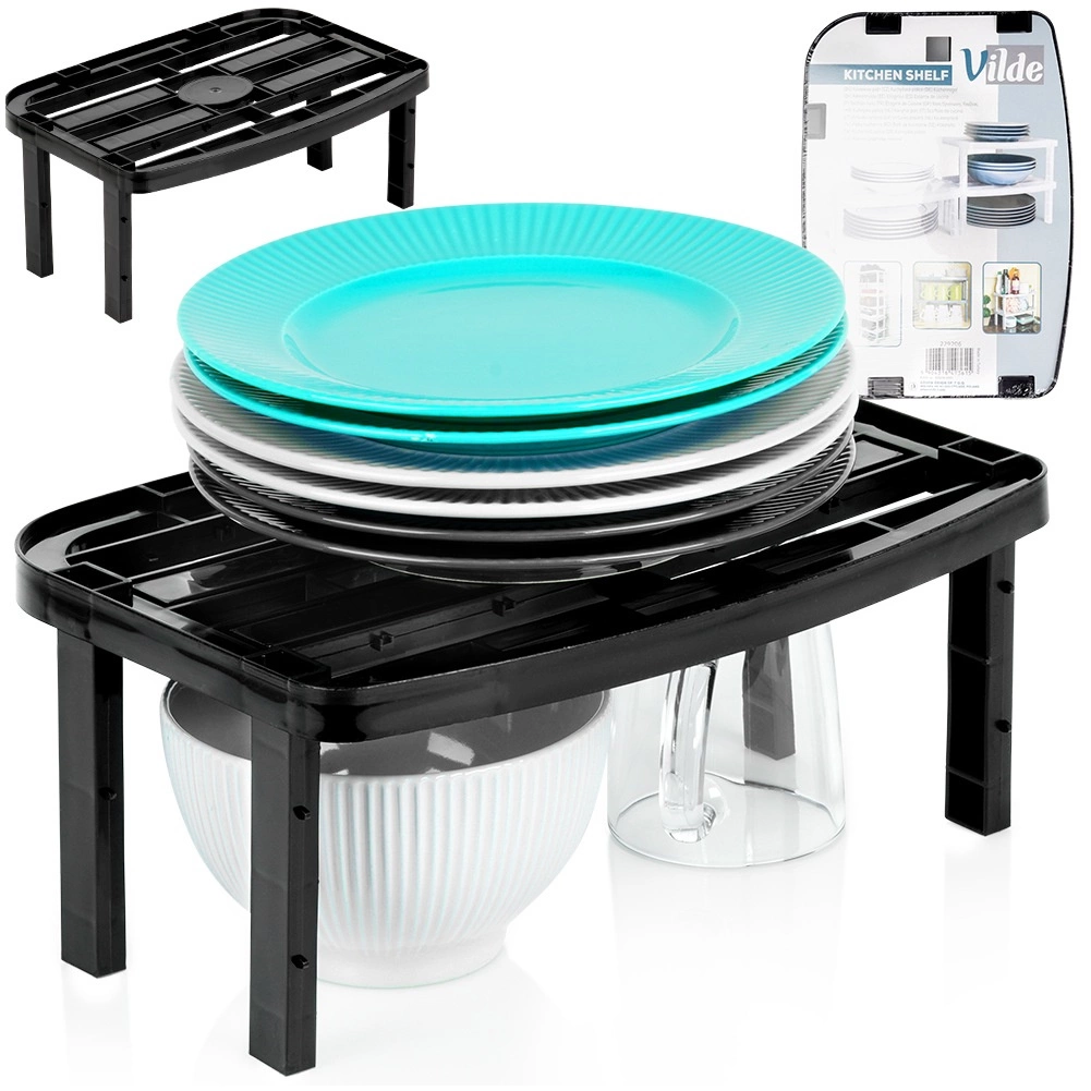Praktikus, elegáns fekete konyhai polc, amely segít maximalizálni a tárolóhelyet a szekrényekben és a munkalapon. A kétféle cserélhető lábnak köszönhetően könnyen beállítható a 14,5 cm vagy 11,5 cm magasság. Ideális tányérok, bögrék, fűszerek és dobozok rendszerezéséhez, a stabil és tartós kialakítás pedig lehetővé teszi több polc egymásra helyezését a még jobb szervezésért.