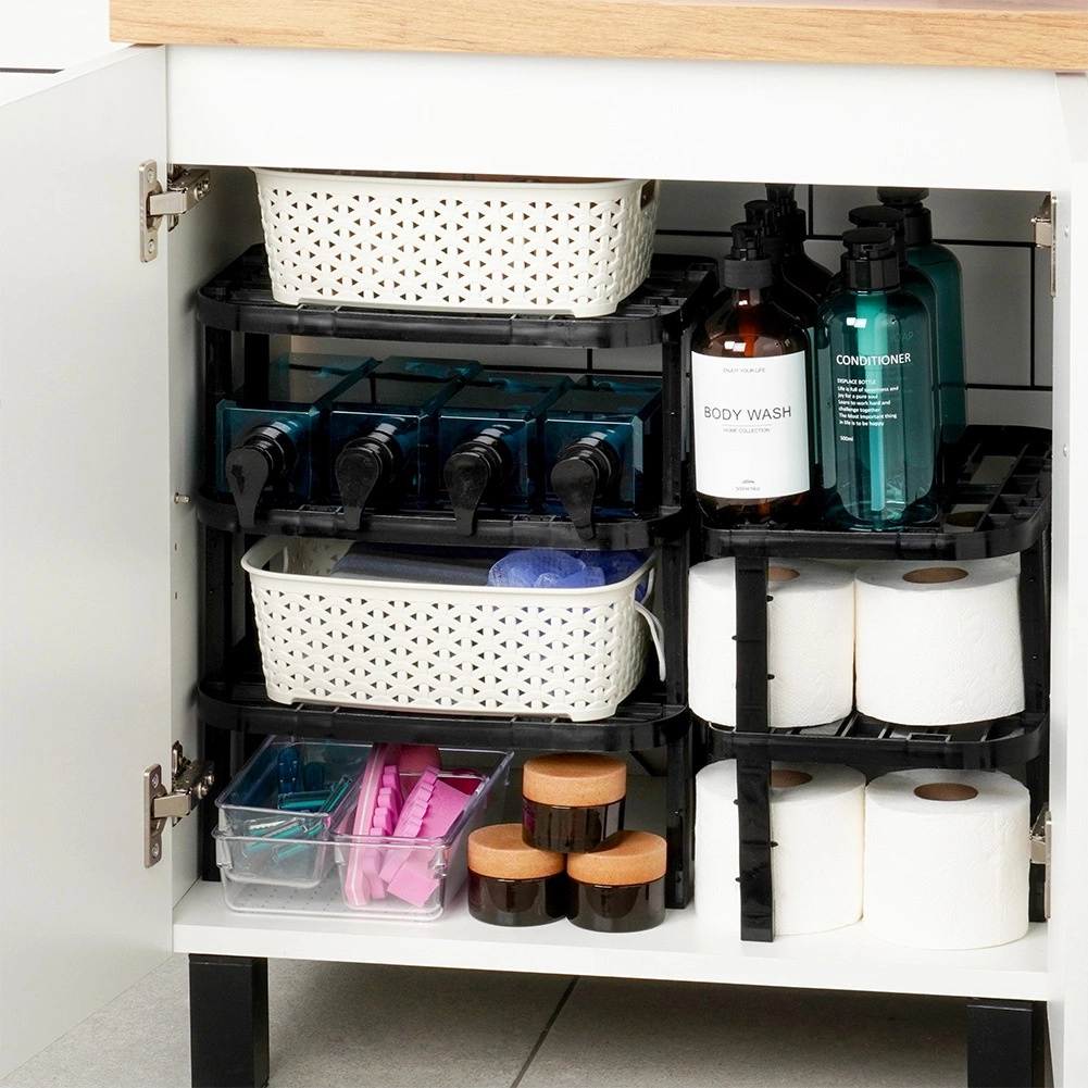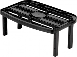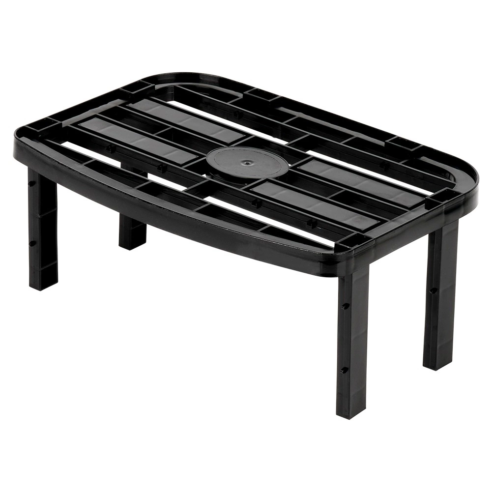 A masszív, fekete műanyag szerkezet stabil, könnyen tisztítható, és a kétféle lábnak (13 cm és 10,5 cm) köszönhetően a végeredményként 14,5 cm vagy 11,5 cm magasság állítható be. A polc konyhába, kamrába, fürdőszobába és irodába is alkalmas, továbbá egymásra rakható, így több tárolószint is kialakítható.