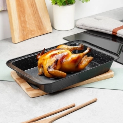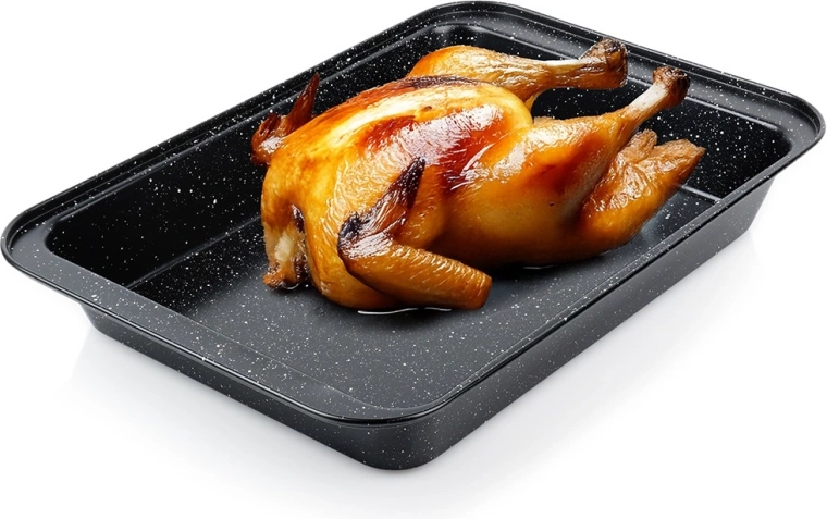 Ez a strapabíró tepsi szénacélból gránit felületkezeléssel egyenletes átsülést biztosít, és minimalizálja az odaégés kockázatát. A tapadásmentes felület lehetővé teszi a sütést minimális zsiradékkal, és jelentősen megkönnyíti a karbantartást – elég nedves ruhával áttörölni vagy kézzel elmosni.