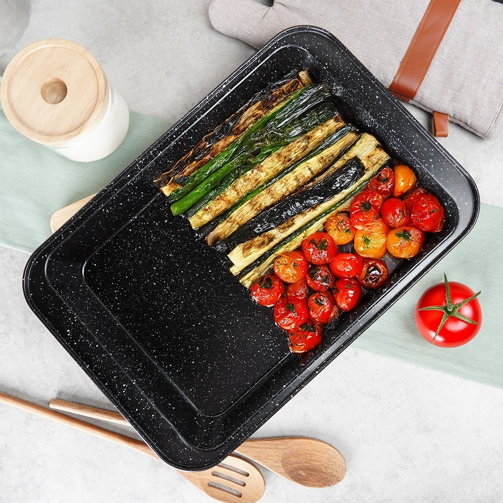Univerzális tepsi gránit tapadásmentes felülettel húsok, zöldségek, piték és házi pizza sütéséhez. A egyenletes hőeloszlásnak, a magas peremnek és a könnyű tisztításnak köszönhetően ideális választás mindennapos sütéshez gáz- és elektromos sütőben is.