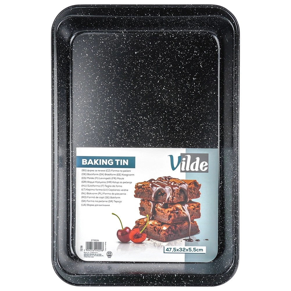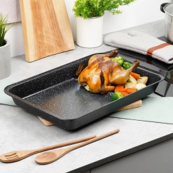 Masszív, téglalap alakú forma gránitbevonattal a megbízható, odaégés nélküli sütési eredményért. Nem szívja magába a szagokat vagy a folyadékokat, és a minőségi szénacél kiválóan vezeti a hőt, így az ételek a teljes felületen egyenletesen sülnek át.