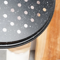 Süssön házi pizzát tökéletesen ropogós alappal. A perforált fenék jobb levegőkeringést és gyorsabb páraelvezetést biztosít, így a tészta egyenletesen átsül és gyönyörűen ropogós marad. A tapadásmentes gránit bevonat minimális zsiradéknál is mérsékli az odaégést, és megkönnyíti a tisztítást.