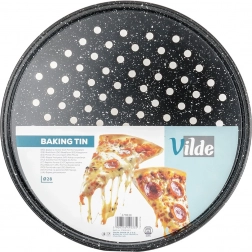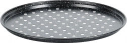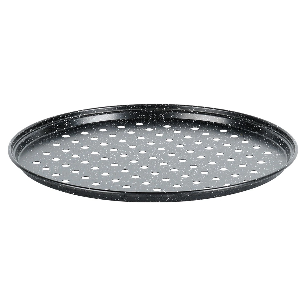Kerek, 28 cm átmérőjű pizzatepsi perforált aljjal a ropogós tésztáért, gránit tapadásmentes bevonattal ellátott szénacélból. Akár 230 °C-ig hőálló, magasabb peremmel az egyszerűbb kezelhetőségért és a szép pizzatartásért. Gáz- és elektromos sütőkhöz is alkalmas.