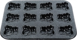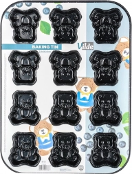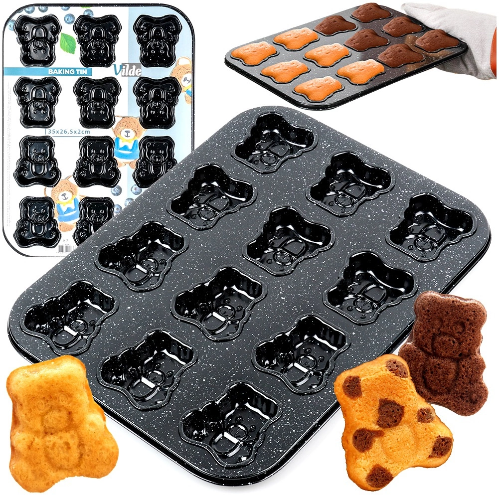 A forma tizenkét, kb. 6,5 × 6 cm-es mackó alakú mélyedést kínál – ideális adag kekszekhez, mini kuglófokhoz vagy muffinokhoz.