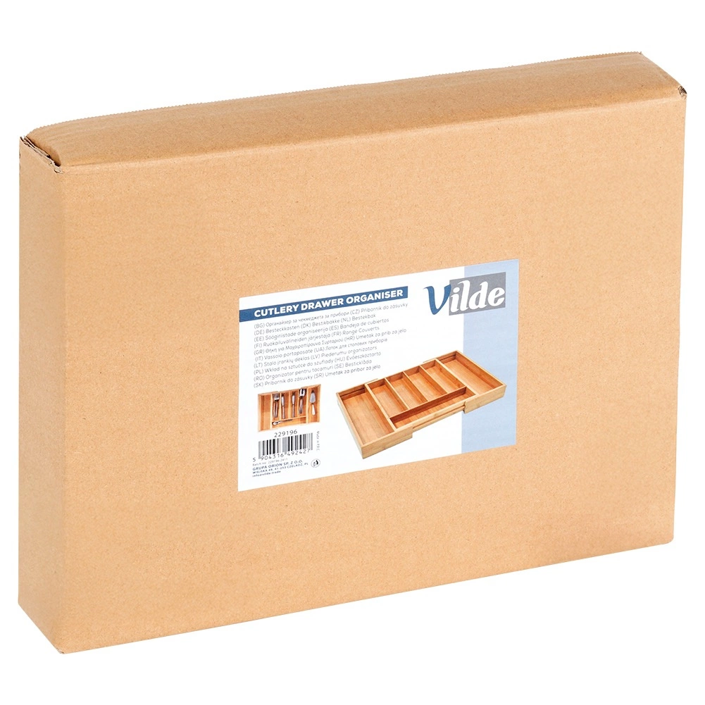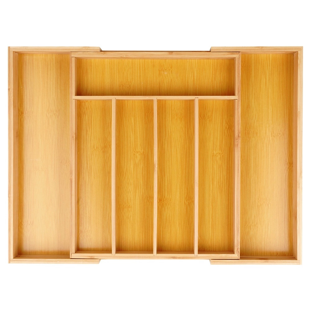 Praktikus bambusz fiókrendező fokozatmentesen állítható, 28–45 cm-es szélességgel, amely tökéletesen rendezetten tartja evőeszközeit, késeit és konyhai eszközeit. A számos rekesznek köszönhetően okos elrendezést és helytakarékos helykihasználást kínál bármely konyhában. Tartós bambuszfából készült a hosszú élettartam és a könnyű tisztítás érdekében.