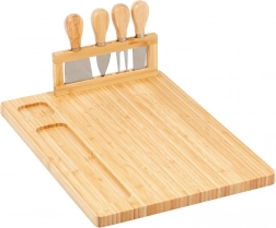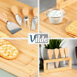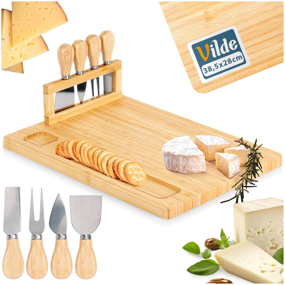 Stílusos készlet sajtrajongóknak: bambusz vágódeszka integrált tartóval és négy rozsdamentes acél eszközzel. Ideális sajtok, felvágottak és snackek szeleteléséhez, adagolásához és tálalásához. A természetes bambusz nedvességálló, gyorsan szárad és nem veszi át a szagokat. Remek otthoni használatra, bulikra és borozós estékhez.