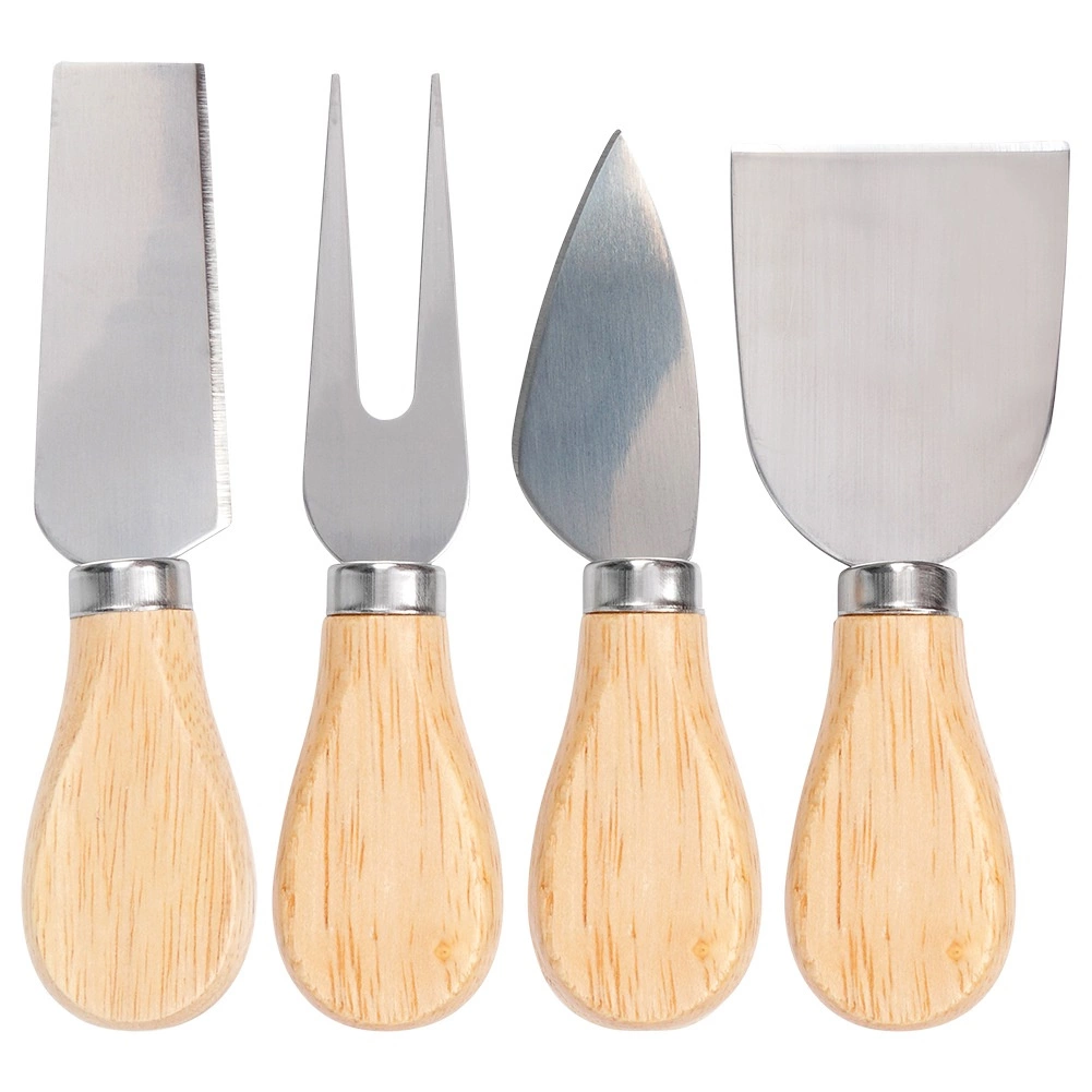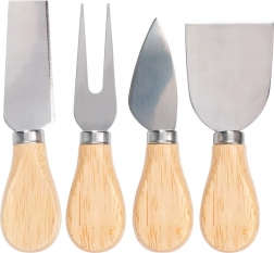 Komplett készlet két késsel, spatulával és villával különféle sajtok szeleteléséhez, adagolásához és tálalásához.