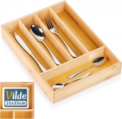 Bambusz evőeszköztartó fiókba 25 × 35 × 5 cm méretben áttekinthető evőeszköz- és konyhai eszközrendezést biztosít. 5 tágas rekesszel rendelkezik, tartós, könnyen tisztítható, és természetes kialakítása révén bármely konyhába illik.