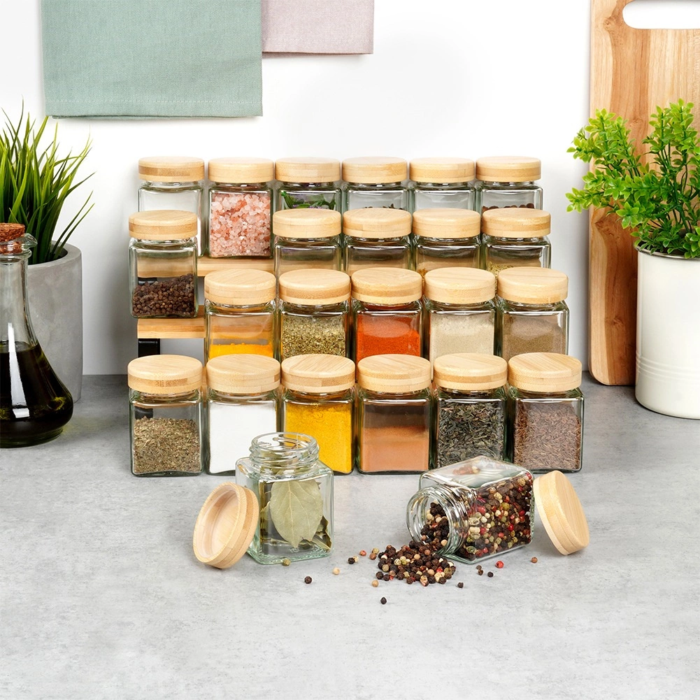 Praktikus 100 ml-es üveg fűszertartó készlet 24 darabbal és 90 matricával az átlátható feliratozáshoz. A átlátszó üveg és a bambusz tetők hosszabb ideig frissen tartják a fűszereket és védik a nedvességtől. A négyzetes forma (5,5 × 5,5 × 7,5 cm) helytakarékos, és esztétikus rendszert teremt a konyhában.