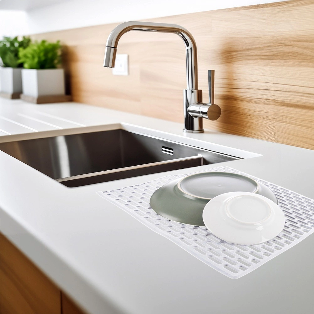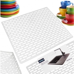 Az univerzális 33 × 28 cm-es méret és a semleges fehér szín könnyen illeszkedik a legtöbb konyhai mosogatóhoz és stílushoz. Az alátét vízálló, könnyen tisztítható, és csúszásgátló struktúrája növeli a biztonságot mosogatás közben.
