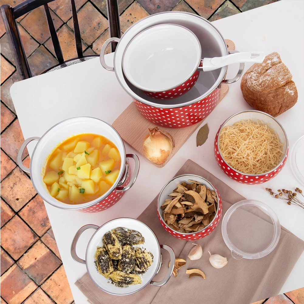 Elegáns, retró dizájnú lábas piros zománccal és fehér pöttyökkel, amely feldobja a konyhát, és nap mint nap praktikus használatot kínál. A hosszú nyélnek köszönhetően kényelmesen tartható és könnyű vele kiönteni. A zománc egészségre biztonságos, allergiásoknak is megfelelő.