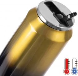 Az elegáns, fekete–arany ombre termoszbögre a modern dizájnt praktikus funkciókkal ötvözi. Tartós rozsdamentes acélból készült vákuumszigeteléssel, amely megbízhatóan tartja az ital hőmérsékletét egész nap. A felhajtható csőrös, tömítőgyűrűs fedél megakadályozza a kifolyást, így bátran beteheti a hátizsákba vagy táskába.