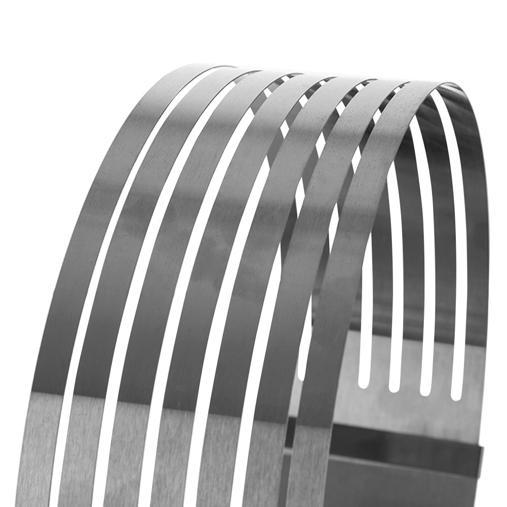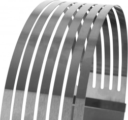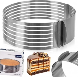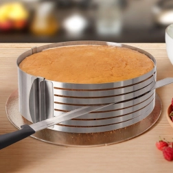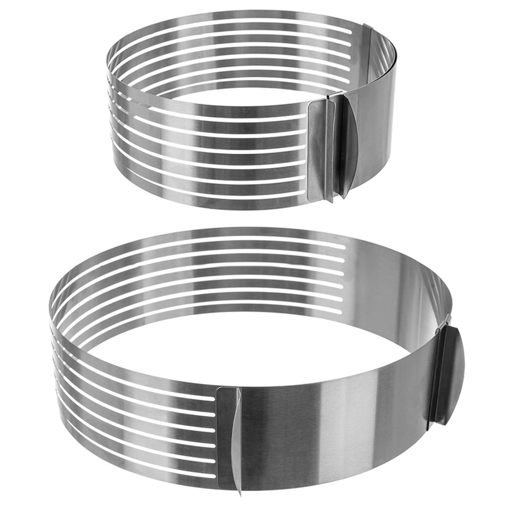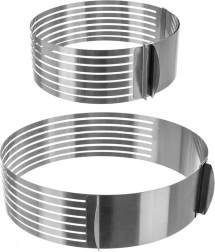 Praktikus, minőségi rozsdamentes acél gyűrű a tortalapok egyenletes szeleteléséhez, akár 7 azonos vastagságú rétegre. A 24–30 cm között állítható átmérőnek és a 8,5 cm magasságnak köszönhetően precíz vágásokat, professzionális megjelenést és könnyű, mosogatógépben végezhető tisztítást biztosít.
