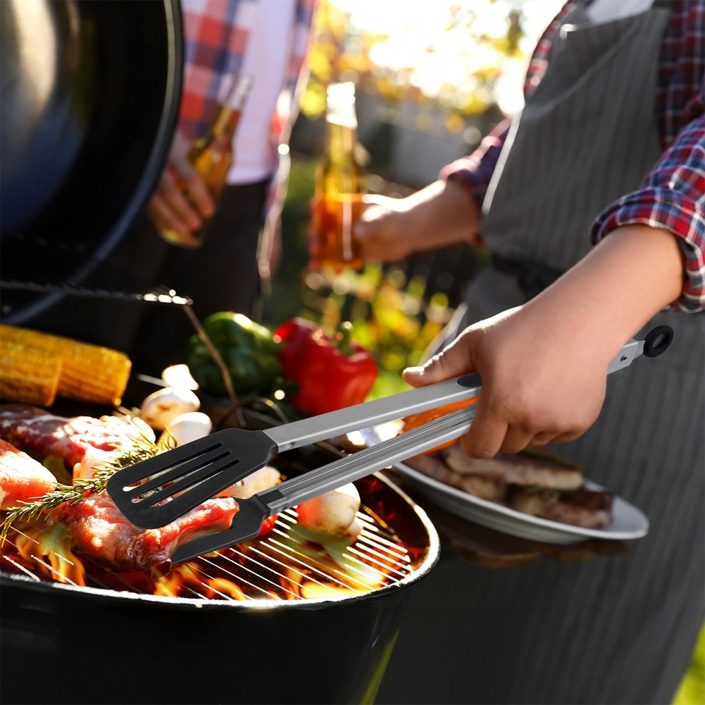 Ez a hosszú grillcsipesz megkönnyíti az ételek kezelését a grillen és a serpenyőben is. A rozsdamentes acél és a hőálló nejlon végek (200 °C-ig) kombinációja biztos fogást ad, miközben óvja a tapadásmentes felületeket. A 44 cm-es hossz a kezeket biztonságos távolságban tartja a hőtől.