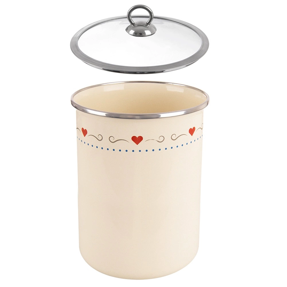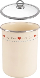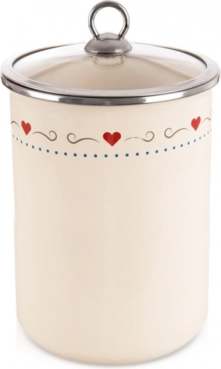 Stílusos konyhai tároló 1,9 l űrtartalommal, zománcozott acélból, krém színben, finom szívecskés mintával. Átlátszó üvegfedéllel és rozsdamentes peremmel a tartalom jobb áttekintéséhez, valamint nedvesség, szagok és szennyeződések elleni védelemhez. Ideális liszt, cukor, kávé, tea vagy rizs számára, könnyen tisztítható és hosszú élettartamú.