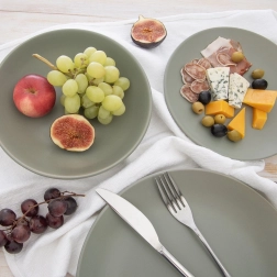 Sokoldalú, 27 cm-es kerámia tányér matt felülettel, olívazöld árnyalatban, amely főételekhez, salátákhoz, desszertekhez, valamint sós és édes finomságok tálalásához is illik. Minőségi kivitelezésének köszönhetően strapabíró és tartós, és könnyen kombinálható más asztali kiegészítőkkel.