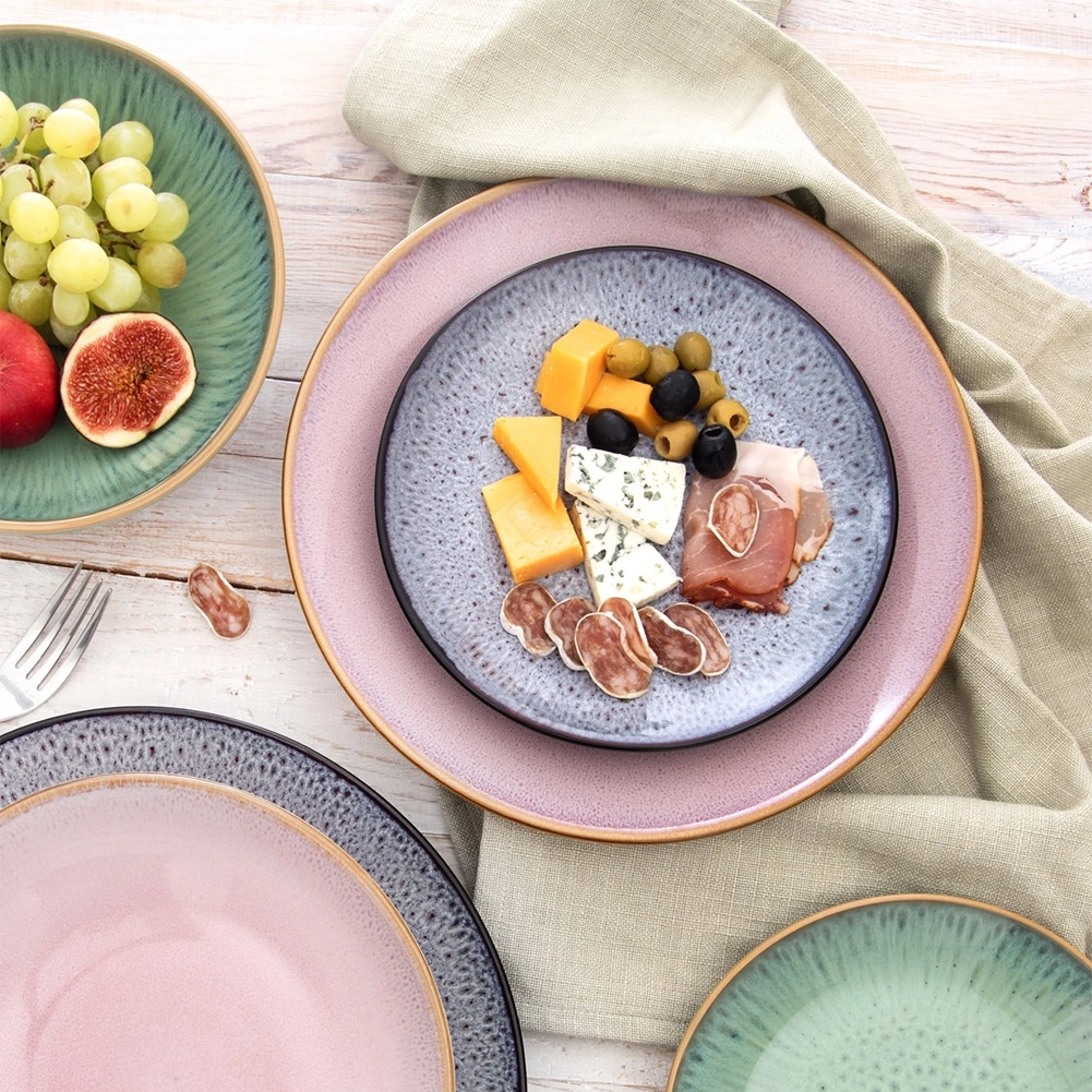 A reaktív, finoman pettyezett máz egyedi megjelenést kölcsönöz a tányérnak, és minden darab különlegesen hat a megterített asztalon.
