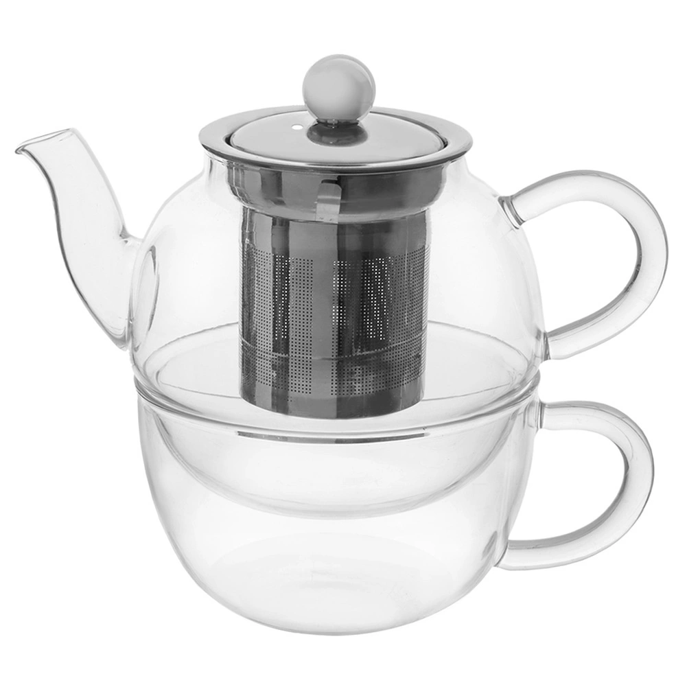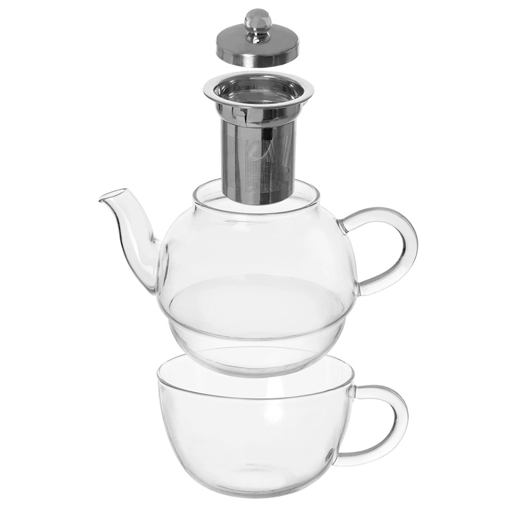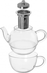 Praktikus és elegáns szett teakedvelőknek: 350 ml-es üveg teáskanna szűrővel és 300 ml-es bögre, amelyek egymásba tehetők. A 180 °C-ig hőálló boroszilikát üvegnek, a finom rozsdamentes acél szűrőnek és a kompakt méreteknek köszönhetően ideális egy adag tea elkészítéséhez otthon és irodában. Az üveg részek mosogatógépben moshatók és mikrohullámú sütőben használhatók.