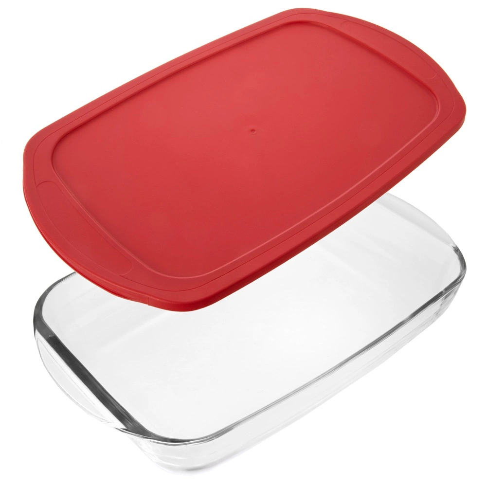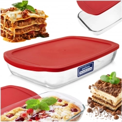 Praktikus üveg sütőtál piros fedővel, 3,7 l űrtartalommal, ideális sütéshez, rakott ételekhez és tálaláshoz. Bórszilikát üvegből készült, amely -20 °C és +300 °C közötti hőmérsékletnek ellenáll, kényelmes fogantyúkkal és légmentes fedővel az ételek frissen tartásához és biztonságos szállításához. Alkalmas sütőbe, hűtőbe, fagyasztóba és mosogatógépbe; mikrohullámú sütőben csak fedő nélkül használja.
