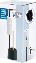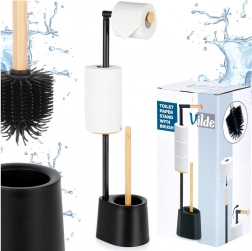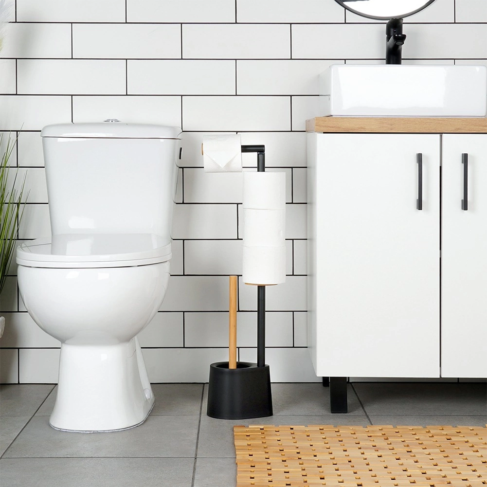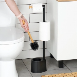 Tartsa áttekinthetőnek a fürdőszobát ezzel az átgondolt állvánnyal, amely adagolja és egyben tárolja a WC-papírt, valamint szilikon sörtéjű WC-kefét tartalmaz a higiénikus tisztításhoz. A minimalista, fekete dizájnt a bambusz természetes akcentusa emeli ki, ízléses és időtálló megjelenést kölcsönözve.