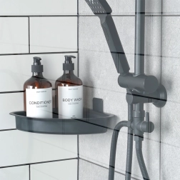 A háromszög forma hatékonyan kihasználja a zuhany sarkát, kézközelben tartja a kozmetikumokat, anélkül hogy útban lenne.