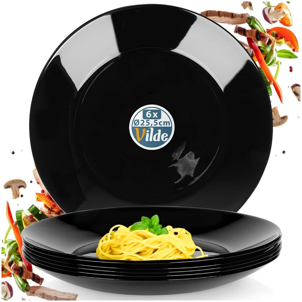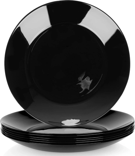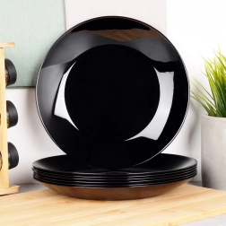 6 darab univerzális lapostányér szettje minőségi opálüvegből, elegáns fekete, fényes kivitelben. Időtálló megjelenésének és tartós kialakításának köszönhetően tökéletesen kiegészíti terítékét – a mindennapi ebédtől a ünnepi lakomáig. Az anyag porcelánhatású, mégis könnyen tisztán tartható és hosszú távon ellenálló.