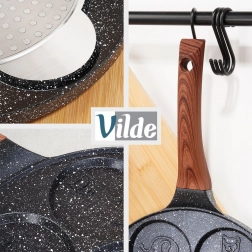 Praktikus gránit serpenyő tojásokhoz és palacsintákhoz 26 cm átmérővel és 7 darab, 8 cm átmérőjű formával a tökéletesen kerek alakért. A tapadásmentes felület minimális zsiradékkal való sütést tesz lehetővé, az egyenletes hőelosztás időt és energiát takarít meg, a Soft Touch nyél pedig kényelmes és biztonságos fogást biztosít. Alkalmas minden típusú főzőlaphoz, beleértve az indukciót is, és mosogatógépben mosható.