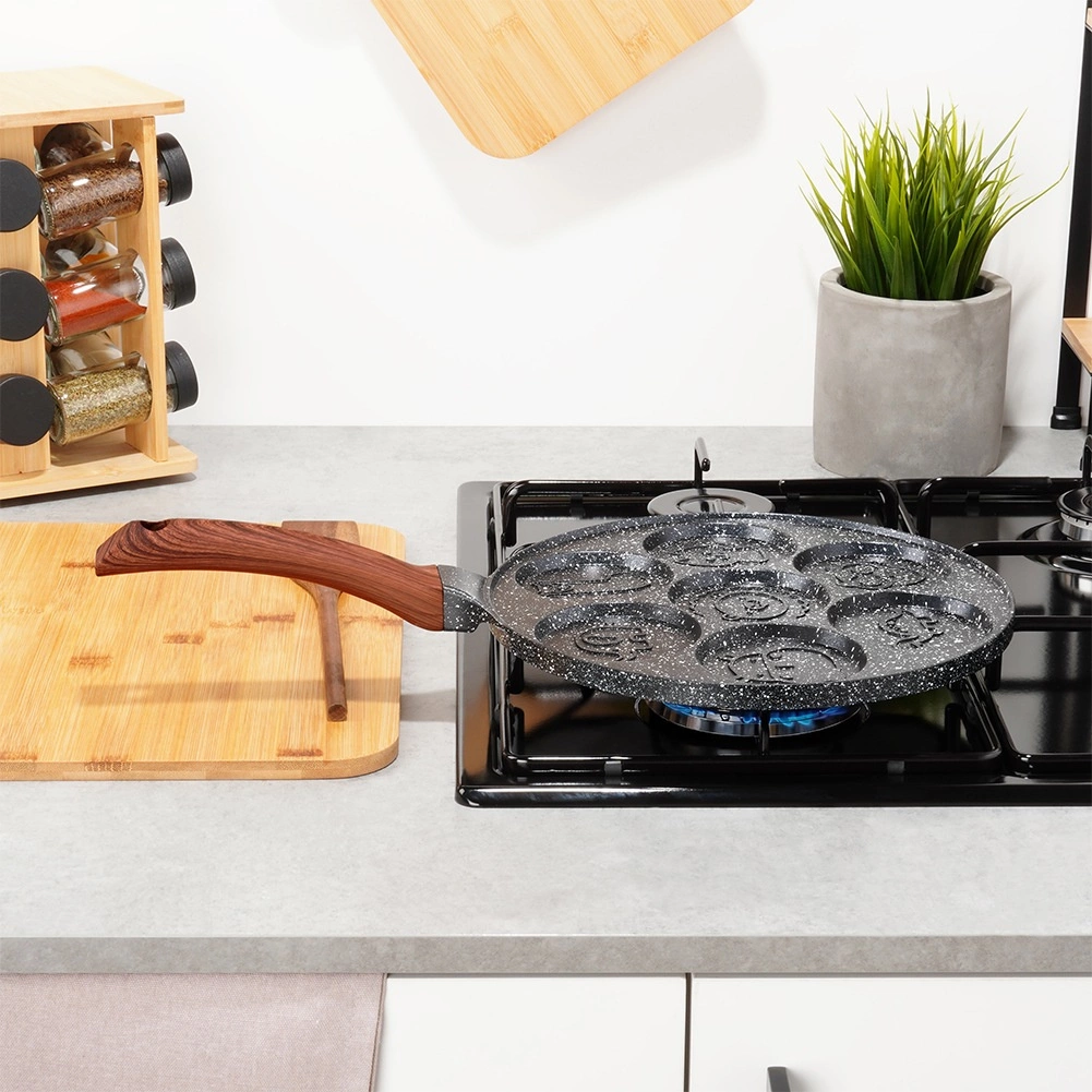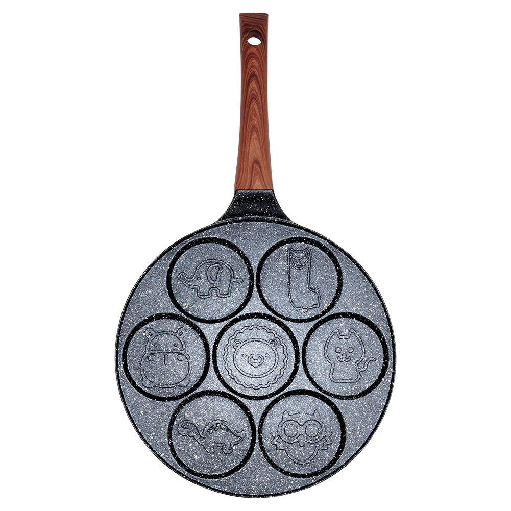 Ez a stílusos, BLACK & WOOD vonalba tartozó serpenyő ideális tojásokhoz, palacsintákhoz és mini palacsintákhoz. A hét kerek mélyedés játékos állatfigurás domborlatokkal szép, egységes formákat készít, és örömöt visz minden reggeli rutinba. A tartós alumínium test gránit bevonattal gyors felmelegedést és hosszú élettartamot garantál.