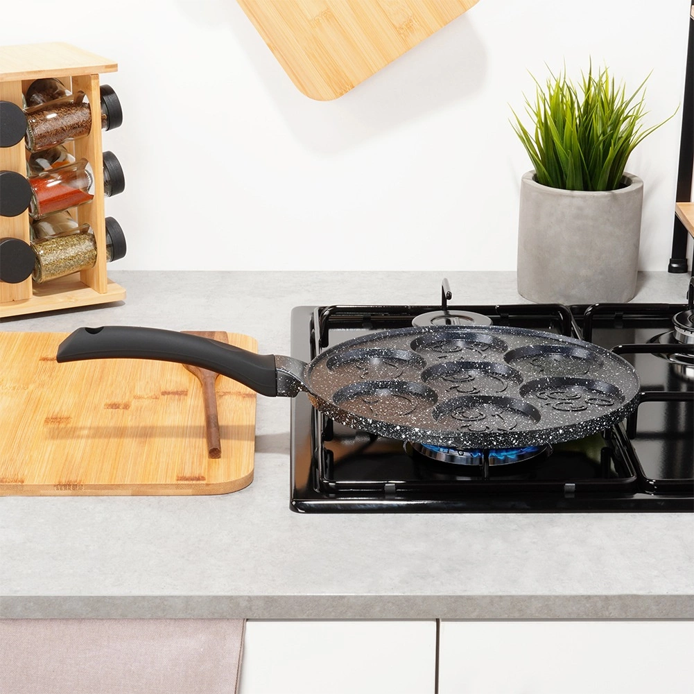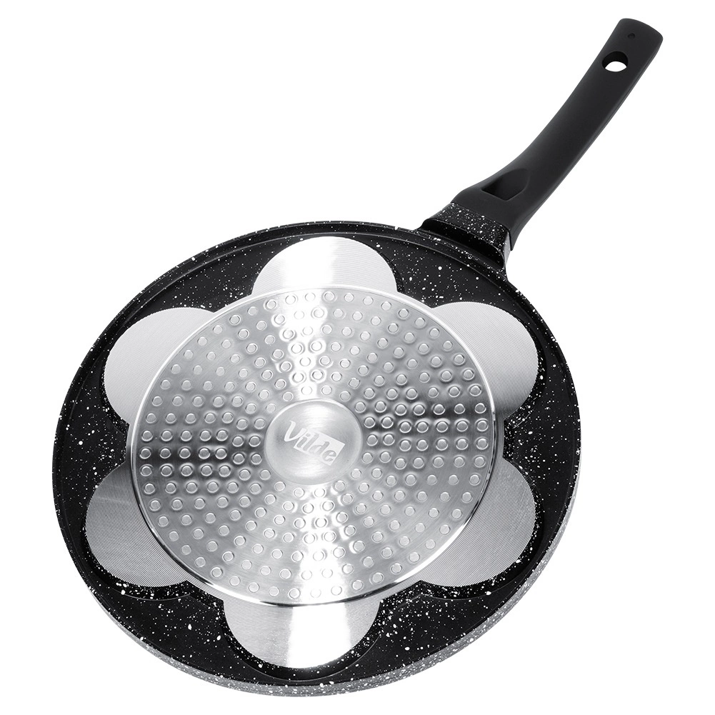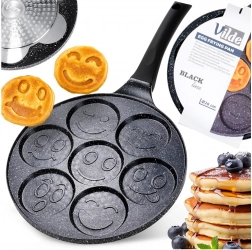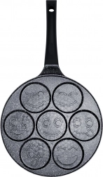 Szórakoztató reggeli palacsintákat és tökéletes tükörtojásokat készíthet könnyedén ezzel a gránit serpenyővel, melyben 7 darab, 8 cm átmérőjű forma található. A tartós tapadásmentes gránit bevonat minimális olajjal is sütést tesz lehetővé, az egyenletes hőeloszlás időt és energiát takarít meg, az ergonomikus Soft Touch nyél pedig biztonságos és kényelmes fogást biztosít. A serpenyő minden tűzhelytípushoz, beleértve az indukciót is, alkalmas, és mosogatógépben mosható.