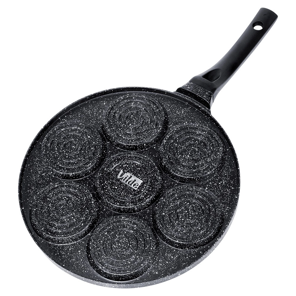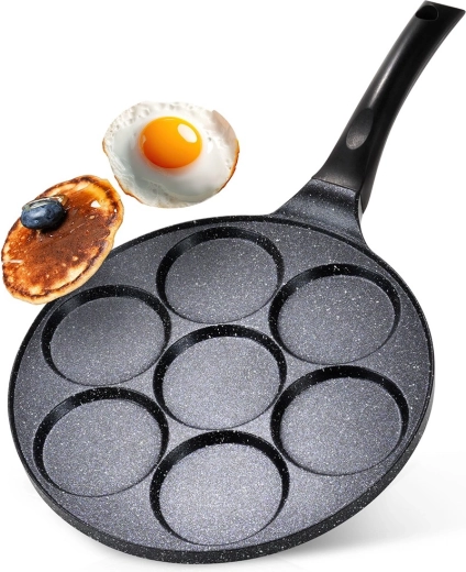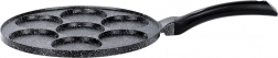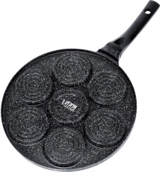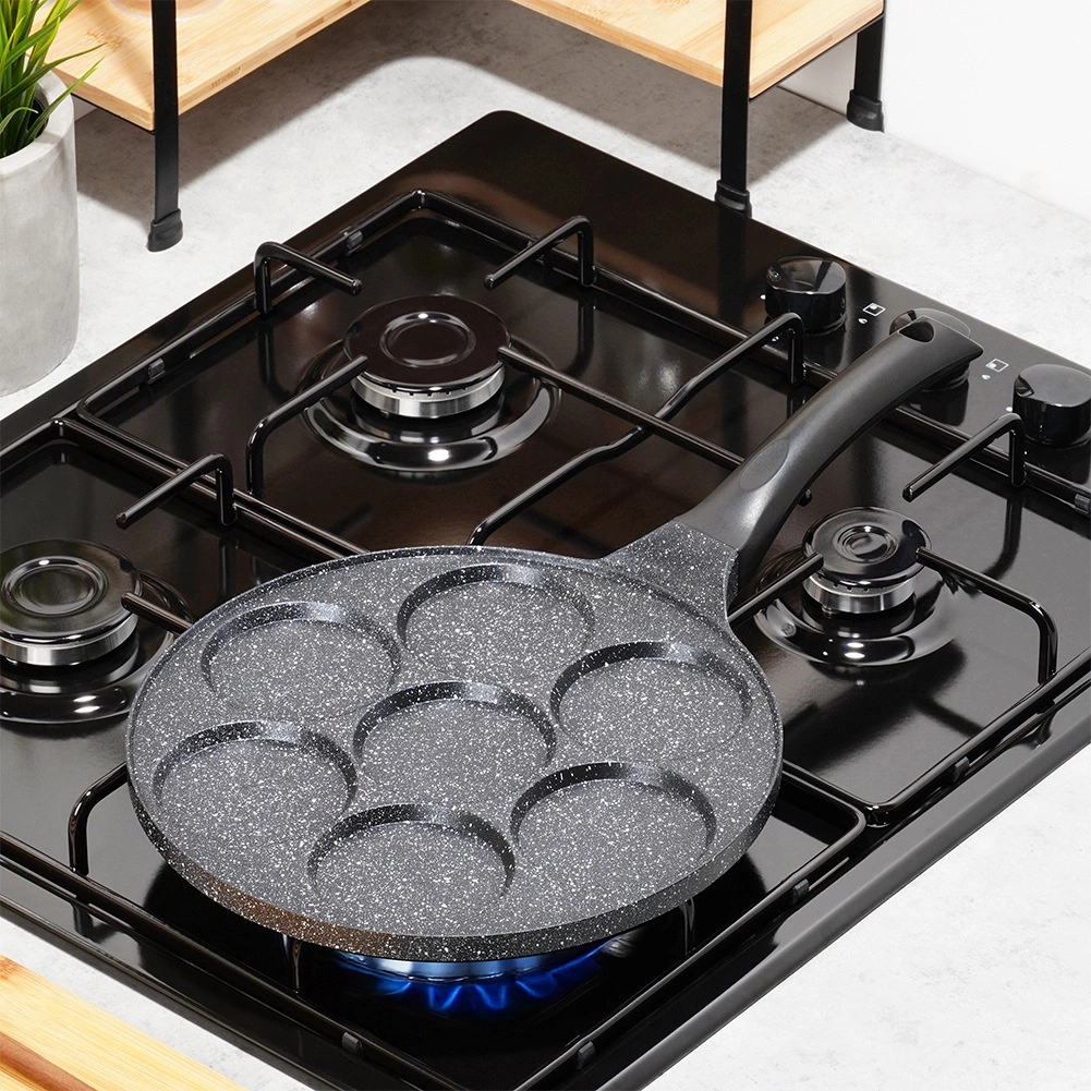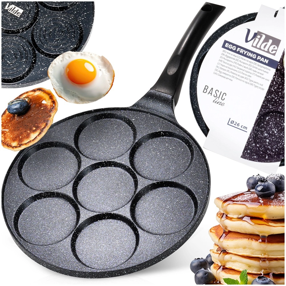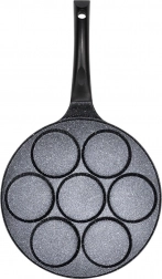 Praktikus gránit serpenyő 7 kerek nyílással (Ø 8 cm) a tökéletesen formázott tojásokhoz, lángosokhoz és mini palacsintákhoz. Könnyű alumínium test tapadásmentes felülettel a minimális zsírral való sütéshez, egyenletes hőelosztás és ergonomikus nyél akasztófüllel. Alkalmas gáz-, elektromos- és kerámia főzőlapokra, valamint mosogatógépbe.