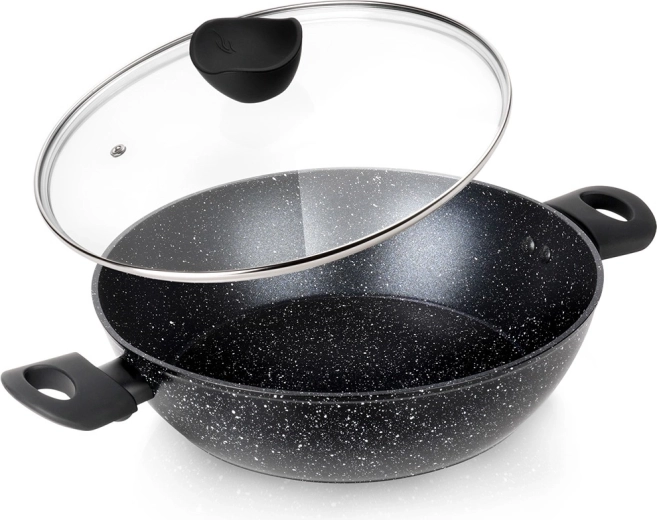 Praktikus és tartós mély serpenyő üvegfedővel, 28 cm átmérővel és 3,5 l űrtartalommal a mindennapi főzéshez, sütéshez és pároláshoz. A tapadásmentes gránit bevonatnak köszönhetően minimális zsiradékkal főzhet, a egyenletes hőeloszlás energiát takarít meg, a minden tűzhelytípushoz, indukcióhoz is alkalmas univerzális talp pedig széleskörű felhasználást garantál. A puha Soft Touch fogantyúk kényelmesek és hőállók, az edény mosogatógépben mosható.