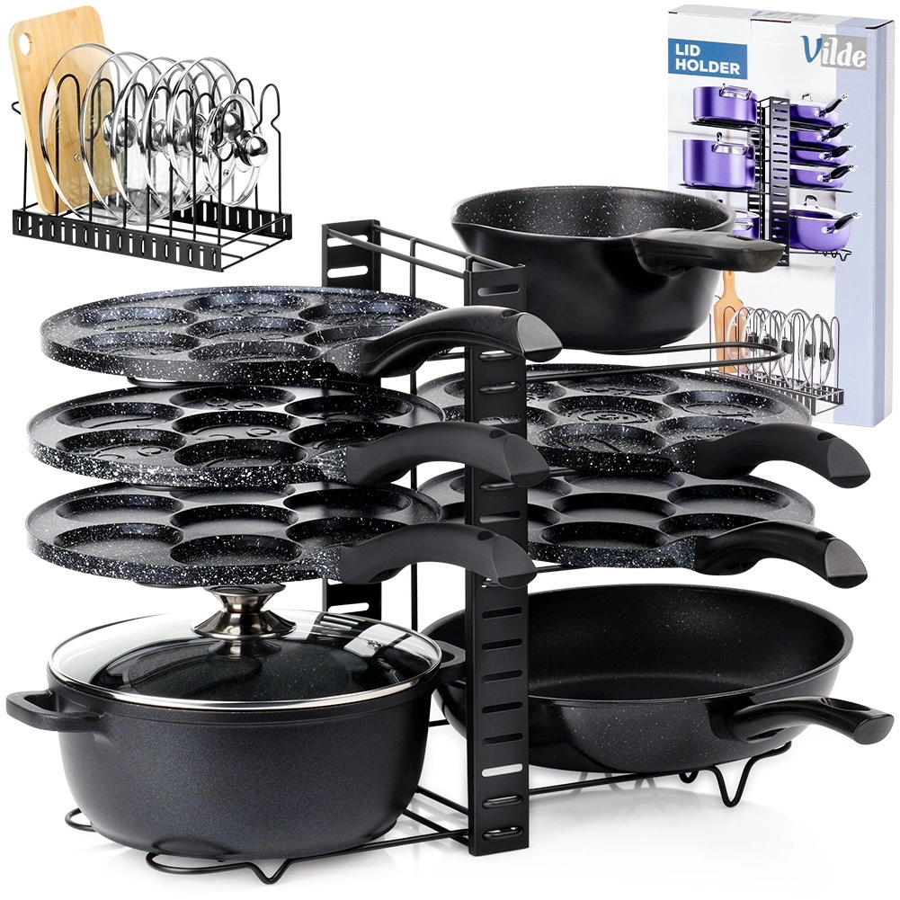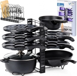 - 2 az 1-ben konyhai szervező lábasokhoz, serpenyőkhöz, fedőkhöz, tányérokhoz és vágódeszkákhoz