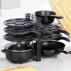 A polcszintek könnyen állíthatók, így kis és nagy serpenyők, mély lábasok és magas fedők is elférnek a tartón.