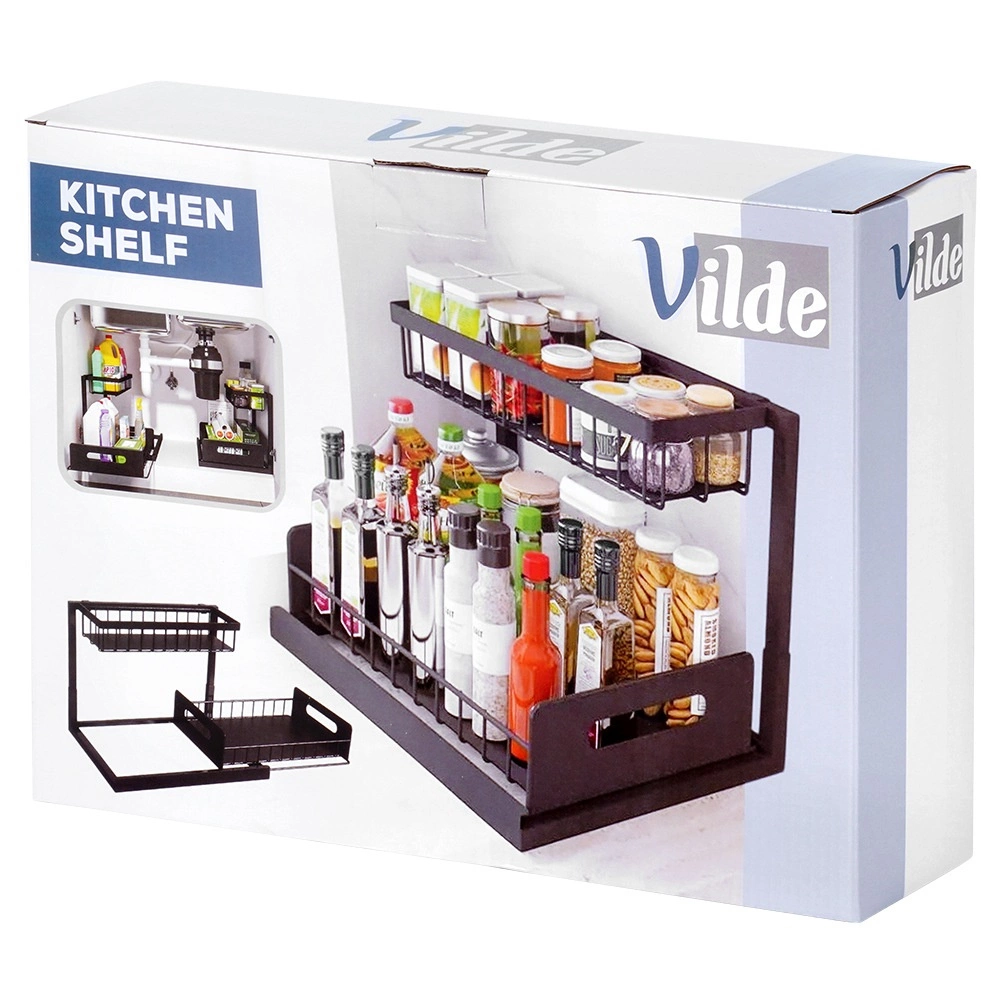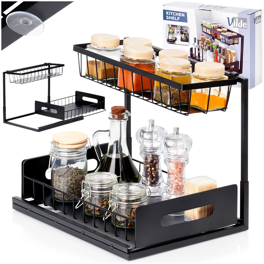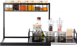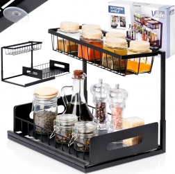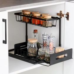 Ez a kétszintes polc 36 × 27 × 28,5 cm méretben okos rendszerezést kínál fűszerekhez, ízesítőkhöz és kisebb üvegekhez. A alsó kosár kihúzható, így mindenről azonnali rálátást és könnyű hozzáférést kap. A polcok közötti 21 cm-es távolság a magasabb őrlők vagy palackok tárolását is lehetővé teszi.