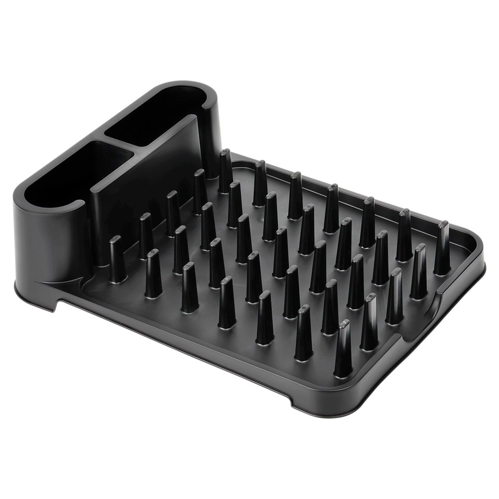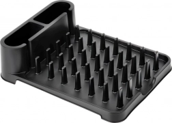 Praktikus, elegáns fekete edényszárító 41 × 32,5 × 11 cm méretben, amely megkönnyíti a tányérok, poharak és evőeszközök szárítását, és egyben megvédi a konyhapultot a víztől. Masszív, tartós kialakítású, külön evőeszközrendezővel és átgondolt, vízelvezetős aljjal a tiszta, rendezett mosogatótérért.