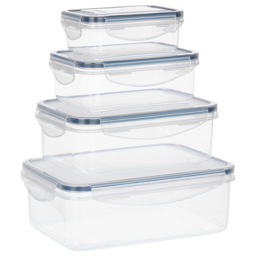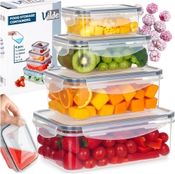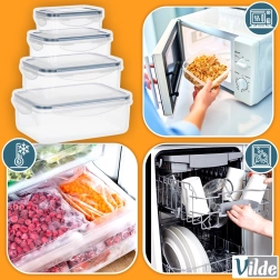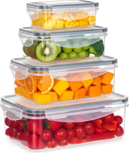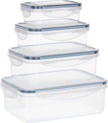 Praktikus, négy átlátszó dobozból álló készlet tetővel és szilikon tömítéssel, amely tovább frissen tartja az ételeket és biztonságos tárolást biztosít. Különböző méretek tároláshoz és előkészítéshez, légmentes zárás négy klippel, BPA-mentes, és alkalmas mosogatógépbe, mikrohullámú sütőbe (tető nélkül) és fagyasztóba.