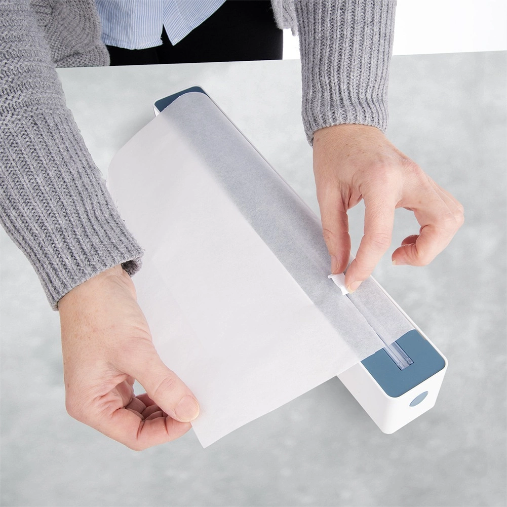 Tartsa rendben a konyhát az elegáns adagolóval, amely ötvözi a gyors méretre vágást, a sorjamentes, tiszta vágást és a kényelmes tekercstárolást. Az integrált, éles élű vágósín simán és egyenesen vág, míg a belső ütközők megakadályozzák a tekercs elcsúszását.