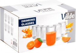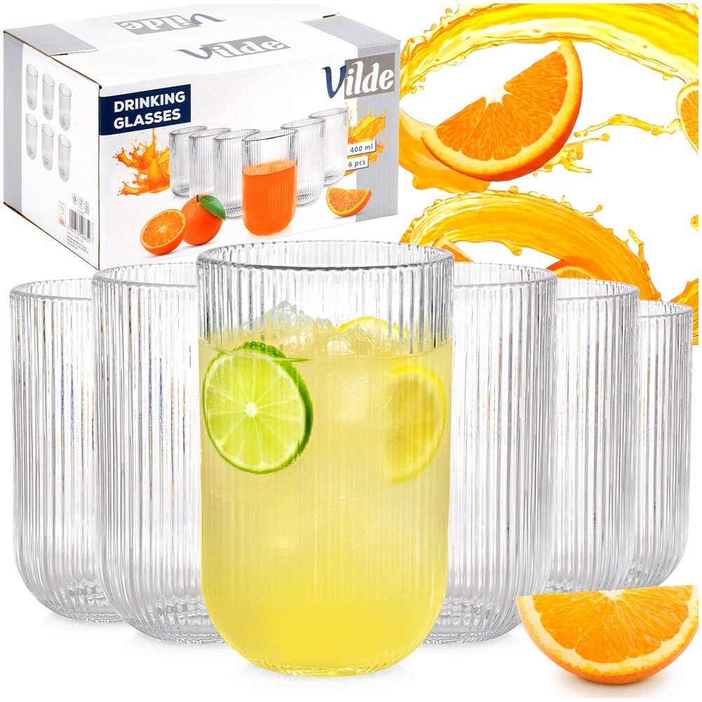 Elegáns 6 darabos, 400 ml-es bordázott pohárkészlet vízhez, limonádékhoz, gyümölcslevekhez és koktélokhoz. Minőségi, vastag, átlátszó üvegből készült, kényelmes fogású és stílusosan kiemeli az ital tartalmát. Mosogatógépben mosható, ideális mindennapi használatra otthon, éttermekben és bárokban is.