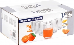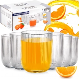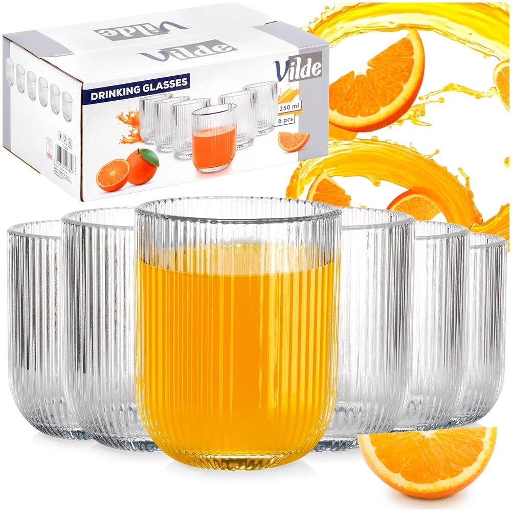 Elegáns, 6 darabos pohárkészlet 250 ml űrtartalommal, minőségi, átlátszó, bordázott üvegből. Stílusos bordázat a jobb fogásért és modern megjelenésért; a poharak sokoldalúan használhatók vízhez, gyümölcslevekhez, limonádékhoz és italokhoz, valamint mosogatógépben moshatók. Ideális a mindennapi használatra otthon és a vendéglátásban is.