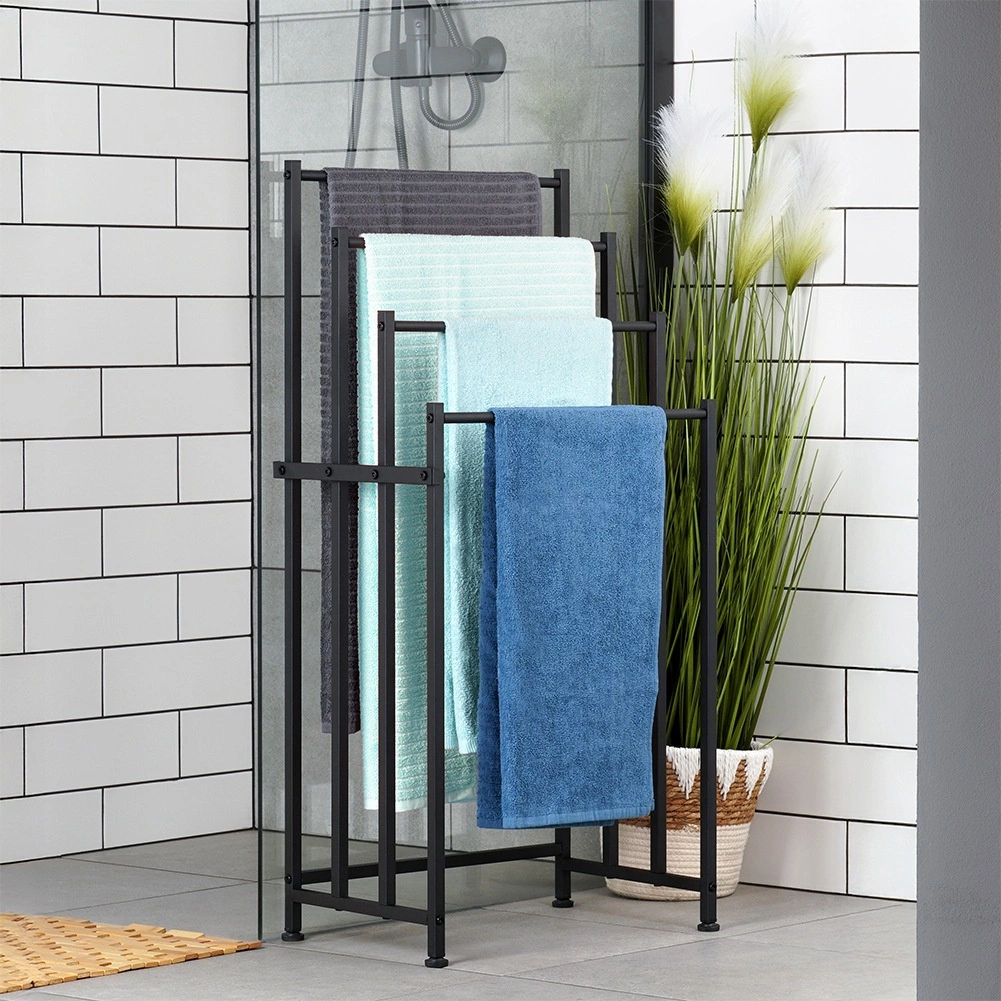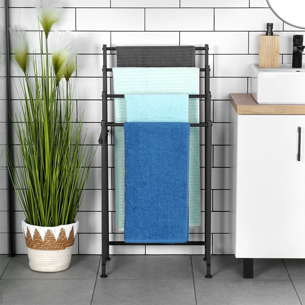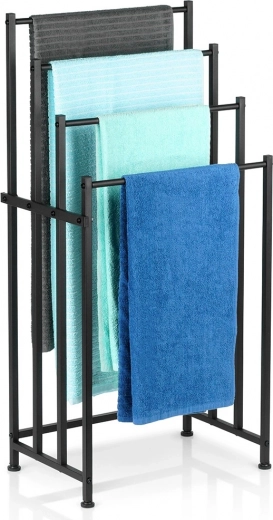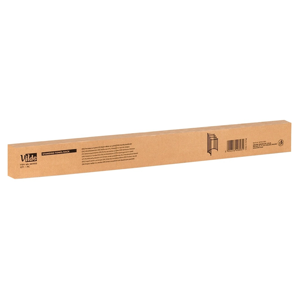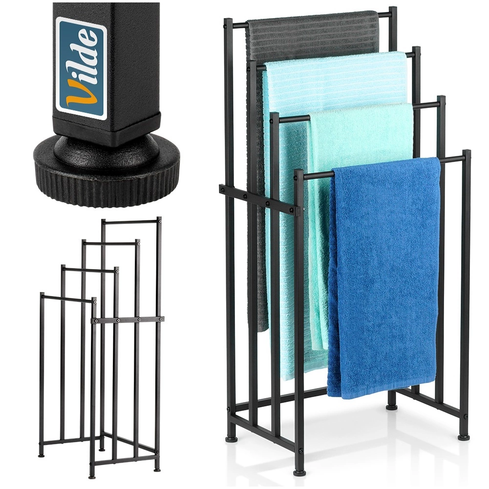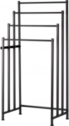 A Vilde szabadon álló fém törölközőtartó praktikus megoldás minden fürdőszobába. A négy masszív rúd több szinten teszi lehetővé több törölköző felakasztását a gyorsabb száradás és a jobb légáramlás érdekében. Az elegáns fekete, porszórt fém modern loft hangulatot kölcsönöz a belső térnek.