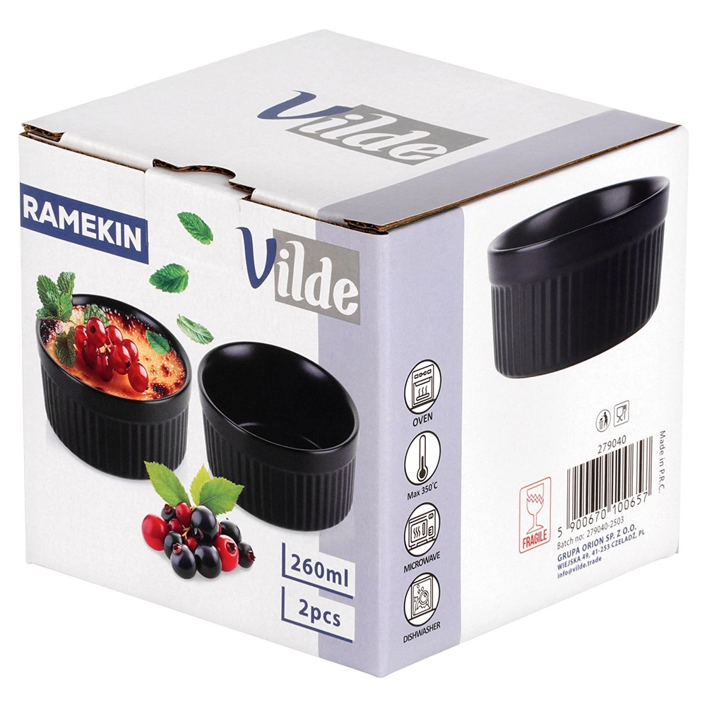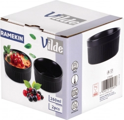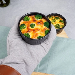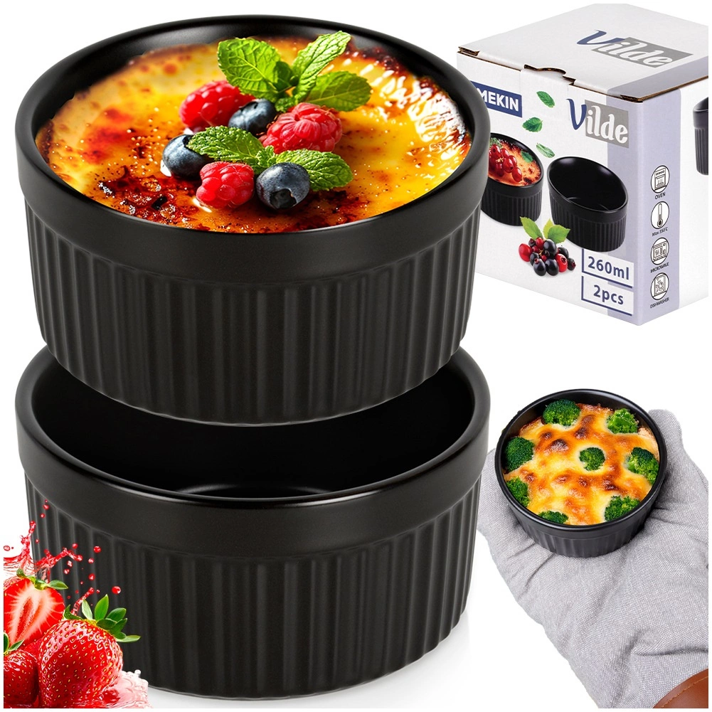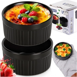Elegáns, 260 ml űrtartalmú, fekete sütőtálkák, ideálisak desszertek és sós finomságok sütéséhez és tálalásához. A tartós porcelán kivitel egyenletes hőeloszlást biztosít, használható sütőben, mikróban és mosogatógépben, és kényelmes az egyes adagok tálalásához. Remek választás crème brûlée-hez, szufléhoz, rakott zöldségekhez és szószokhoz.